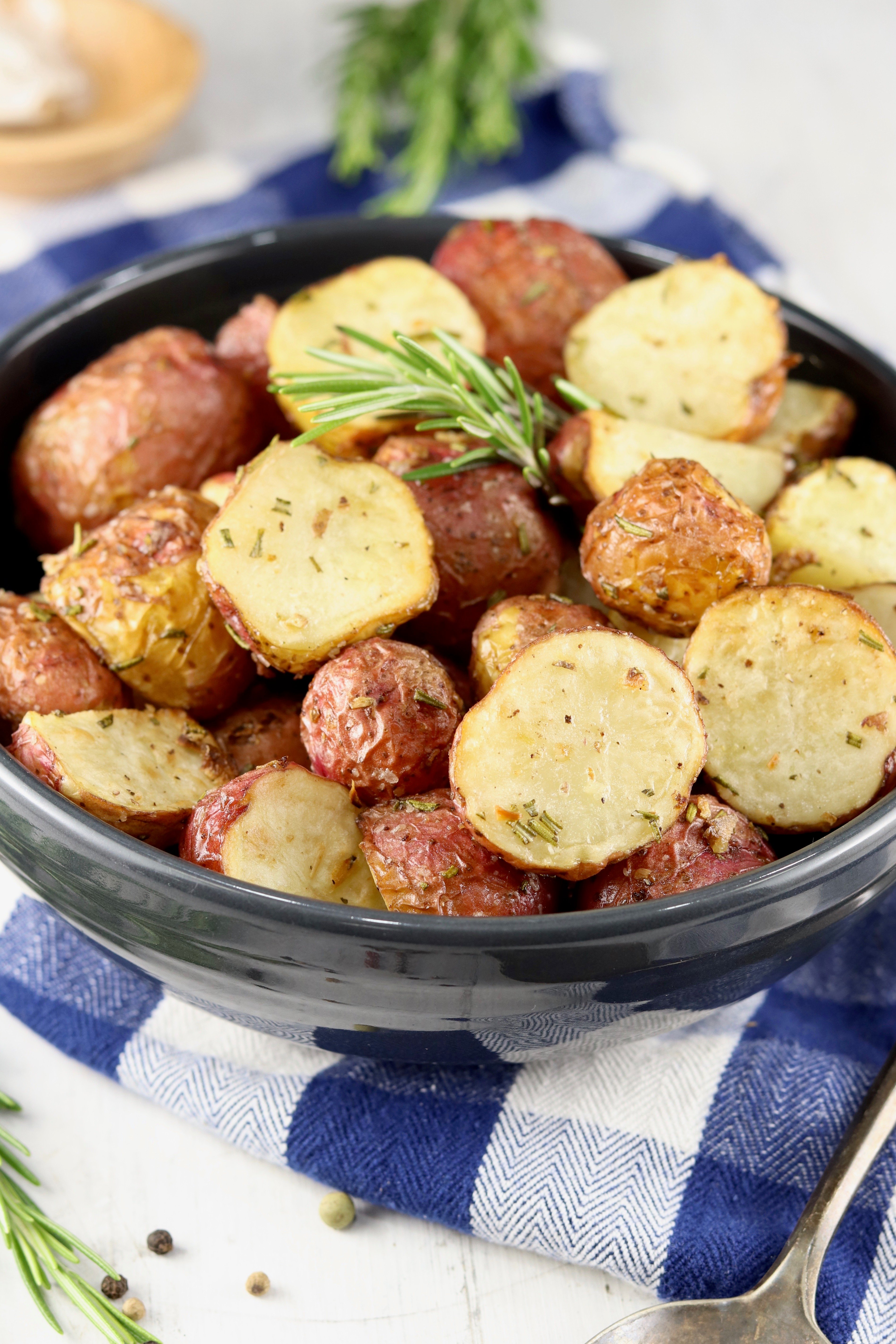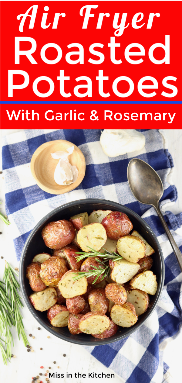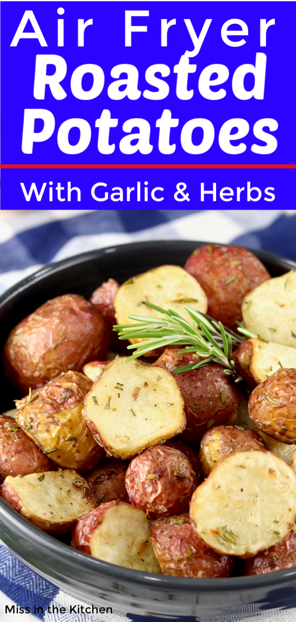 Air Fryer Roasted Potatoes with garlic and herbs is a quick and easy side dish for any meal. Potatoes get crispy on the outside and fluffy on the inside and are full of delicious flavors from the roasted garlic and rosemary.