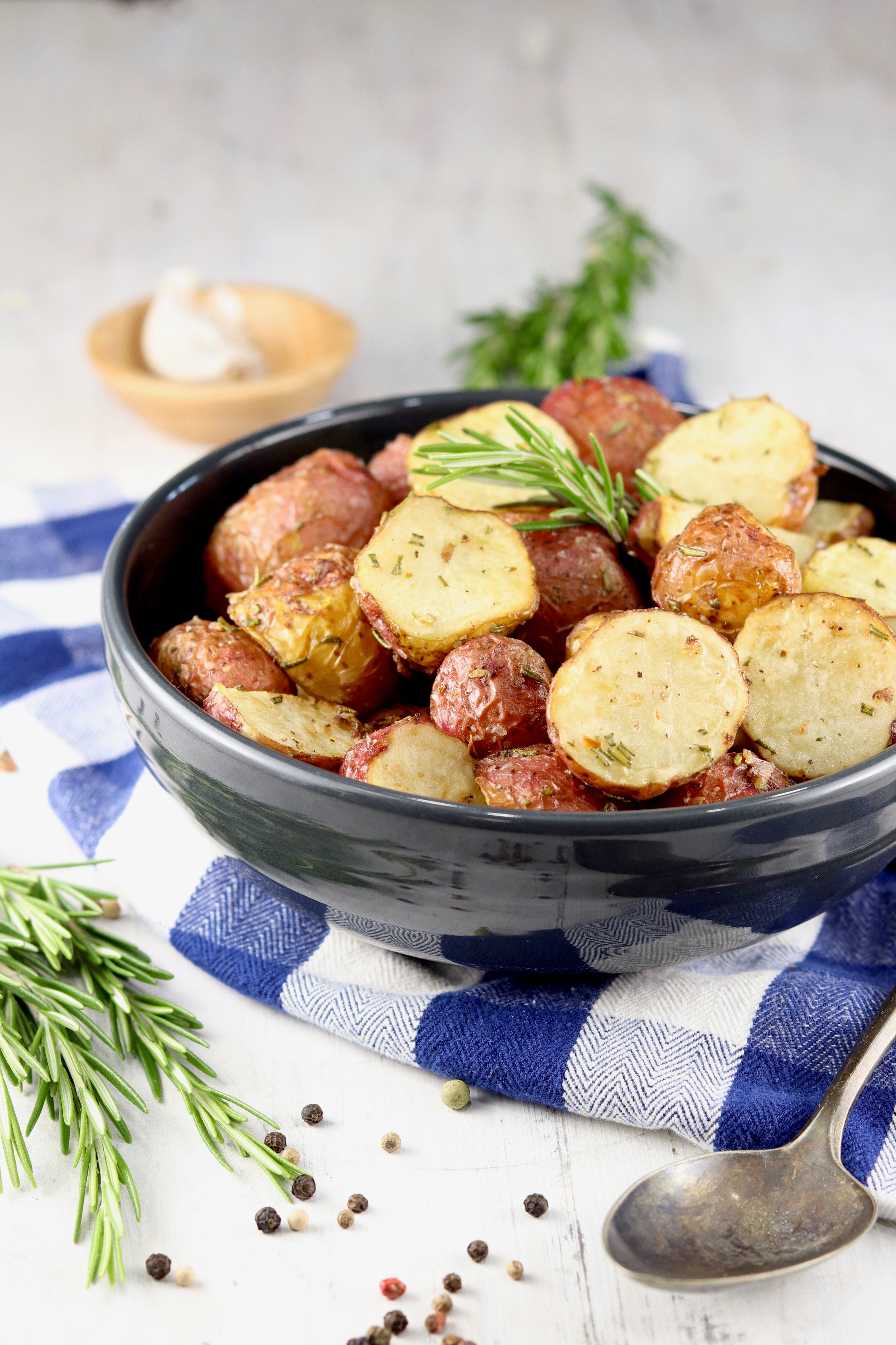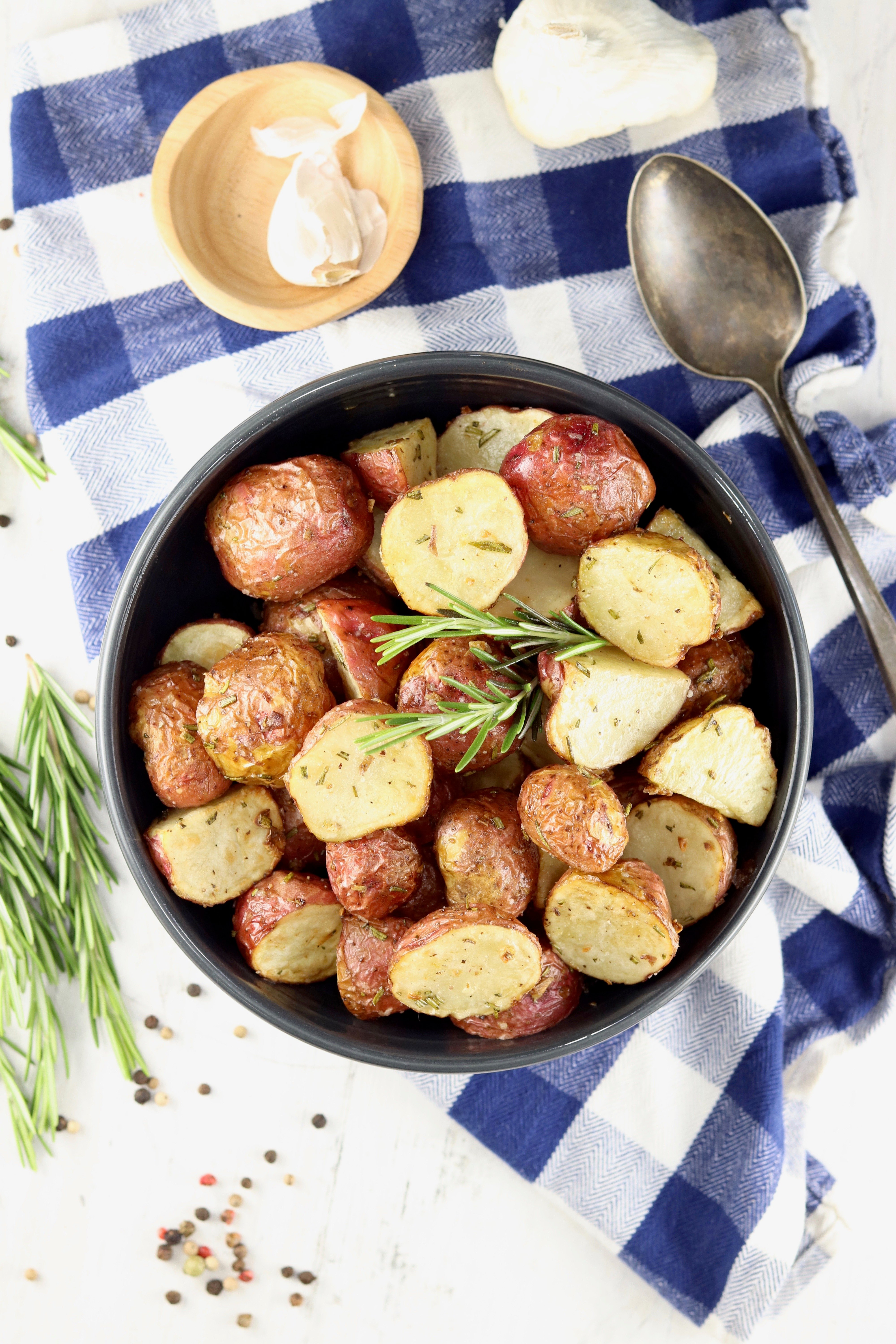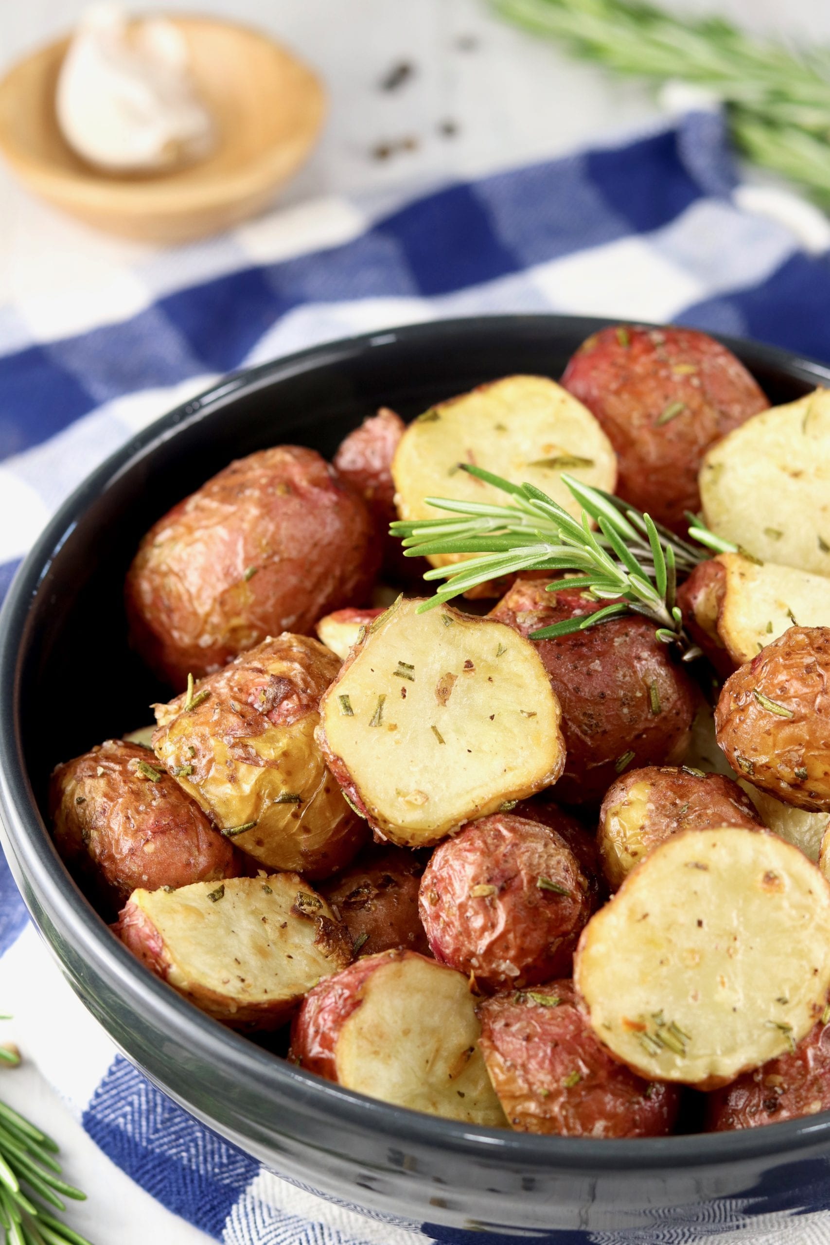 Air Fryer Roasted Potatoes with garlic and herbs is a quick and easy side dish for any meal. Potatoes get crispy on the outside and fluffy on the inside and are full of delicious flavors from the roasted garlic and rosemary.