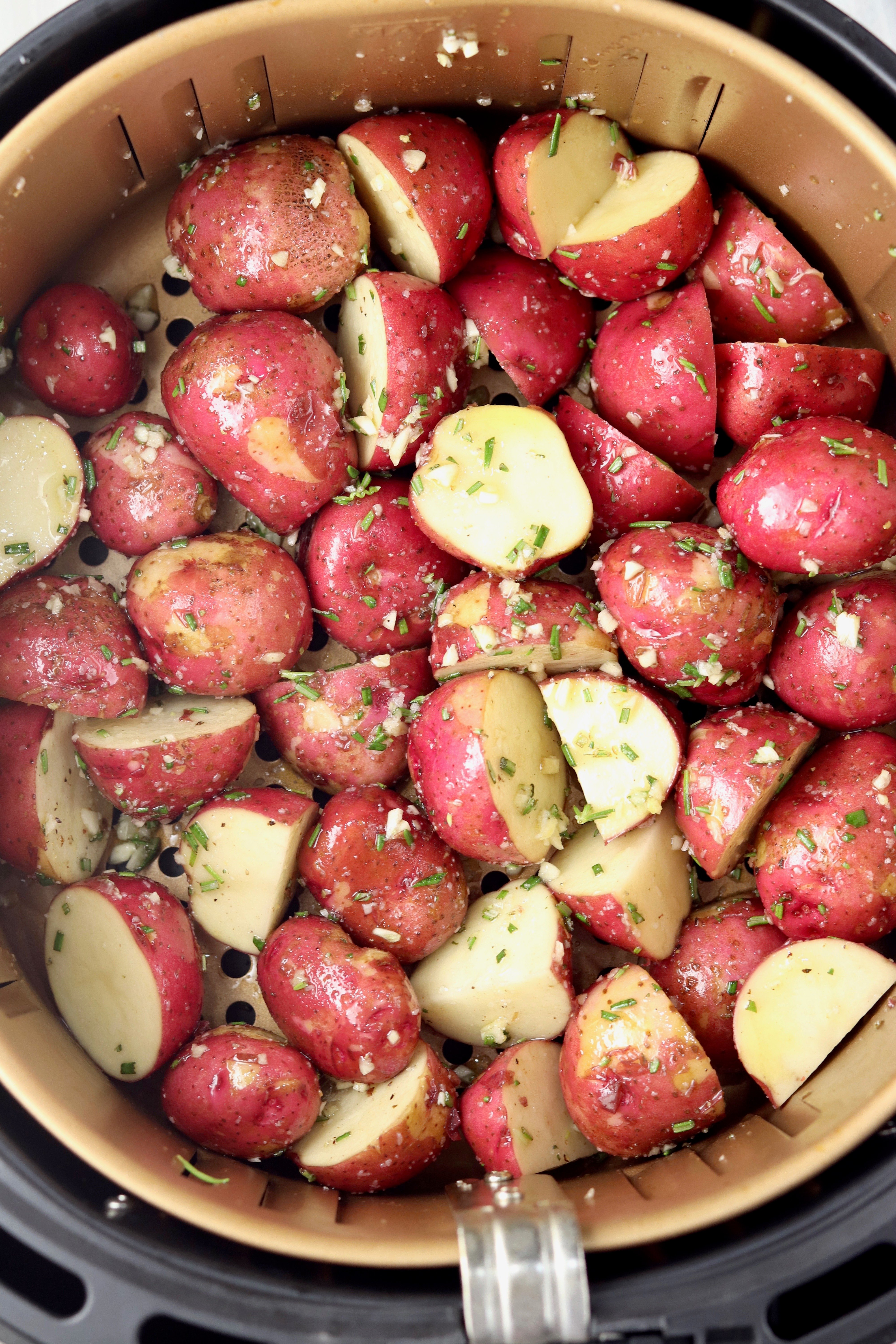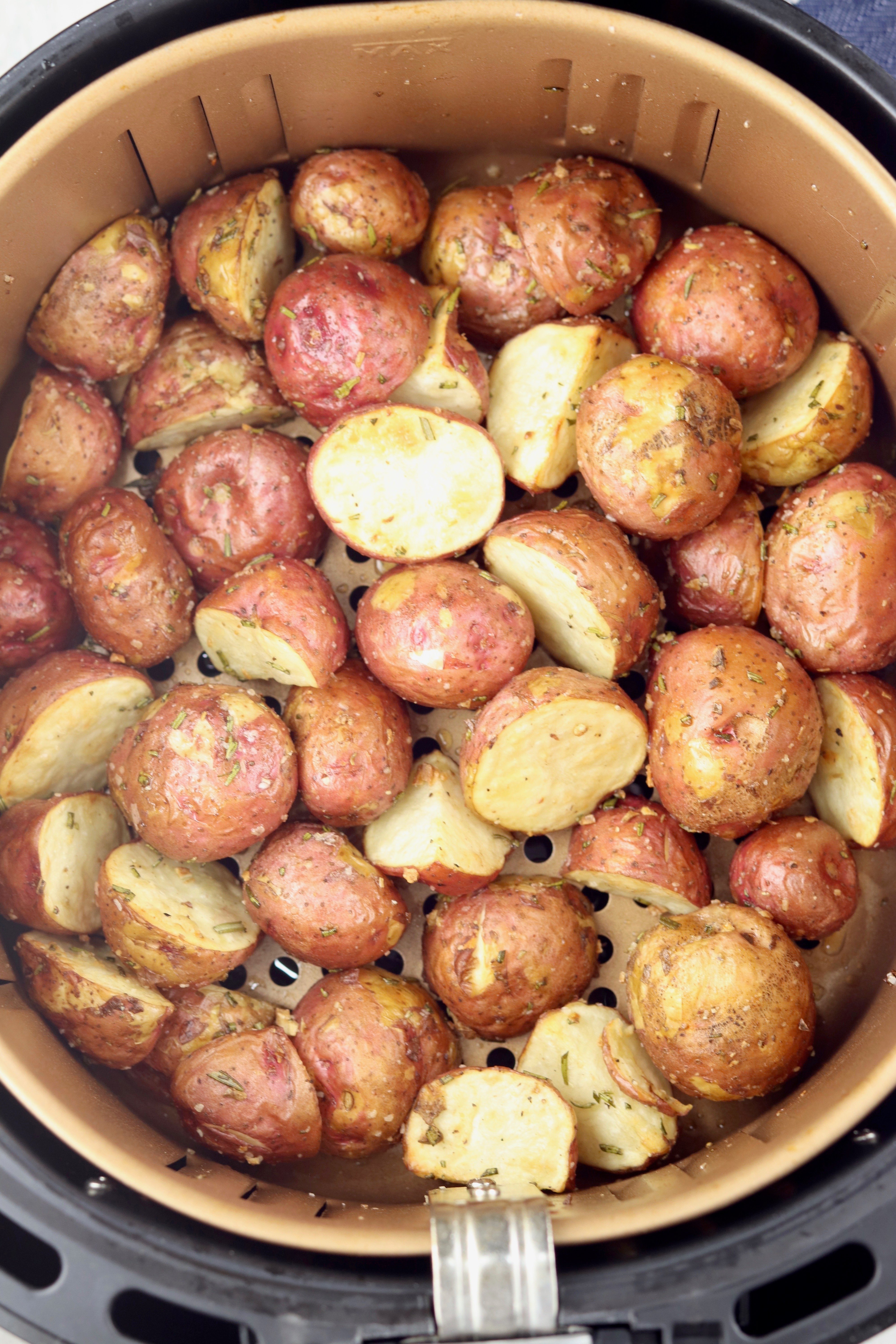 If you don’t have an air fryer, follow the same preparation and layer on a baking sheet. Bake at 400° for 35-40 minutes or until potatoes are cooked through.