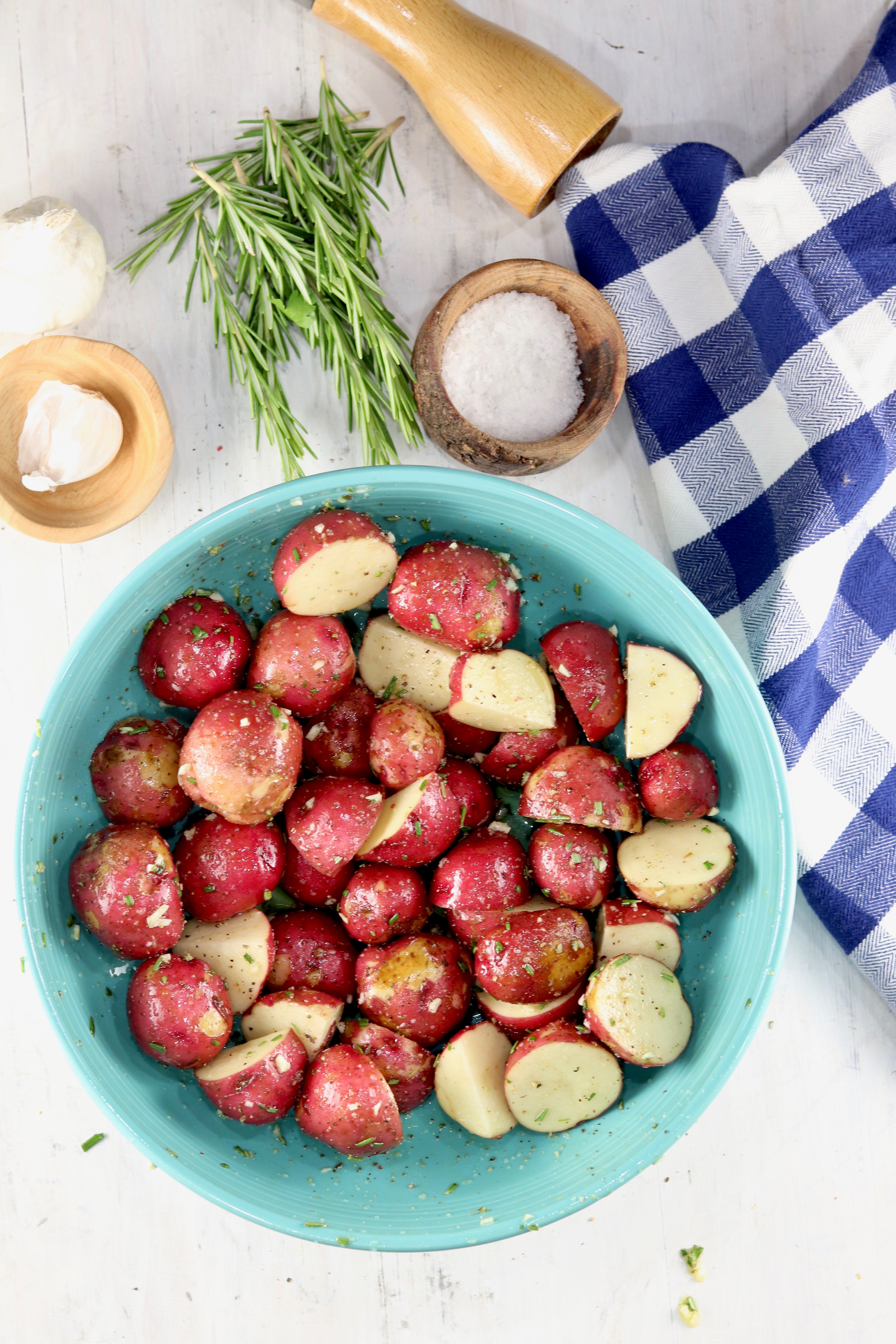 - Place in a large bowl and drizzle with olive oil. Add rosemary, garlic, salt and pepper and toss to coat well.