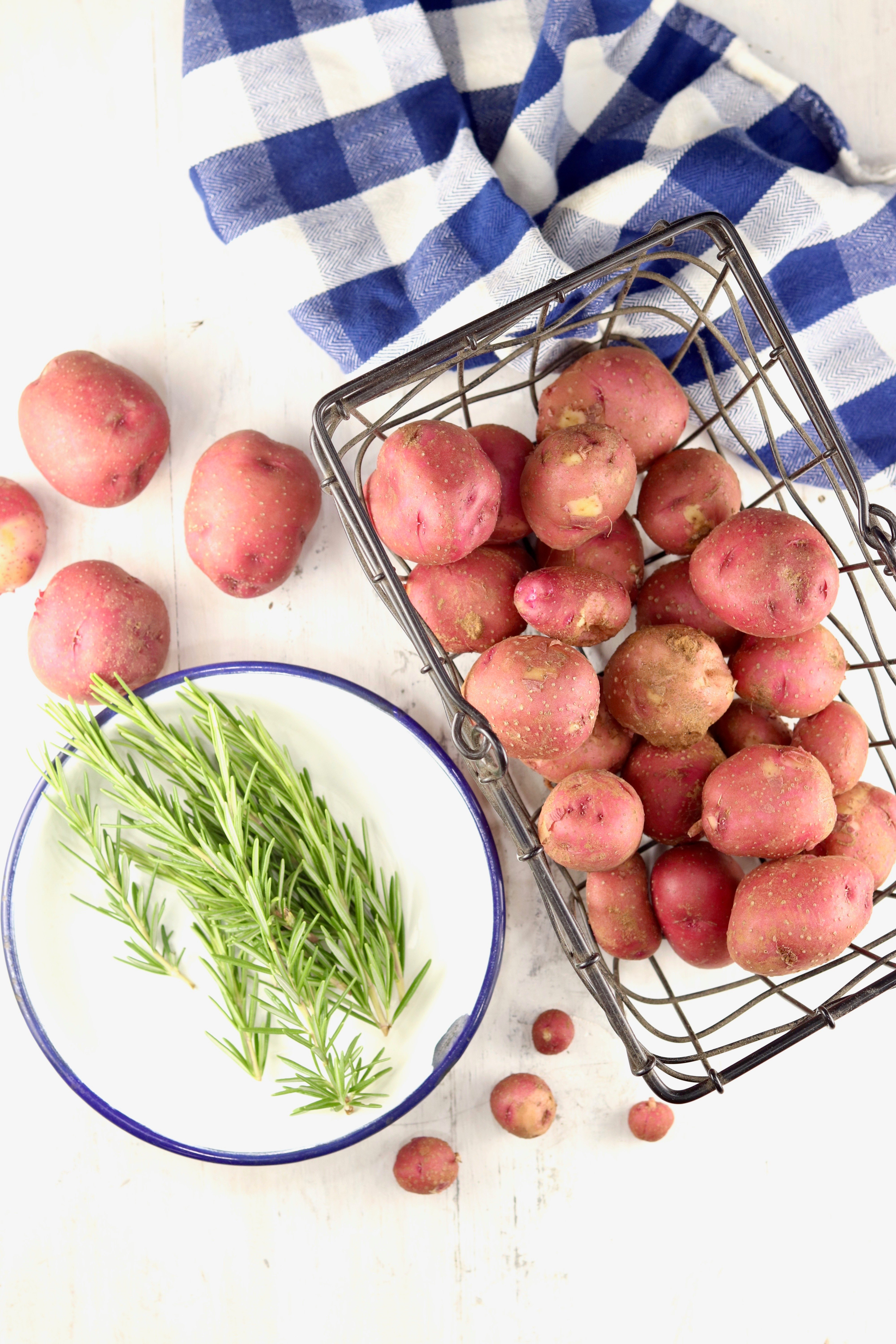 I used baby red potatoes from our garden. Russets or Yukon gold potatoes would also be delicious. You can scrub them and cook with the skins on or peel them if you prefer.