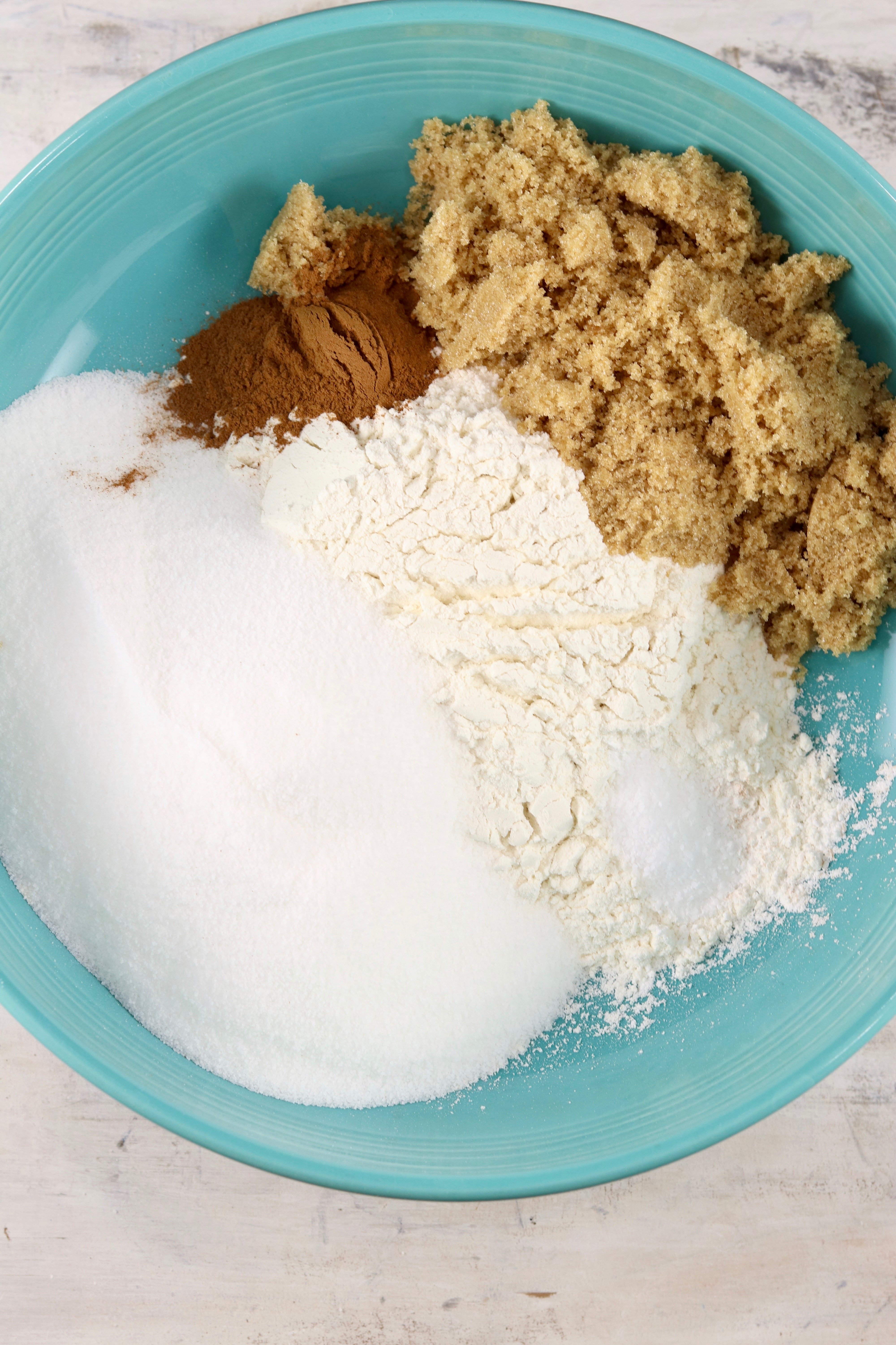 - In a mixing bowl, combine flour, sugar, brown sugar, cinnamon, baking powder and salt.