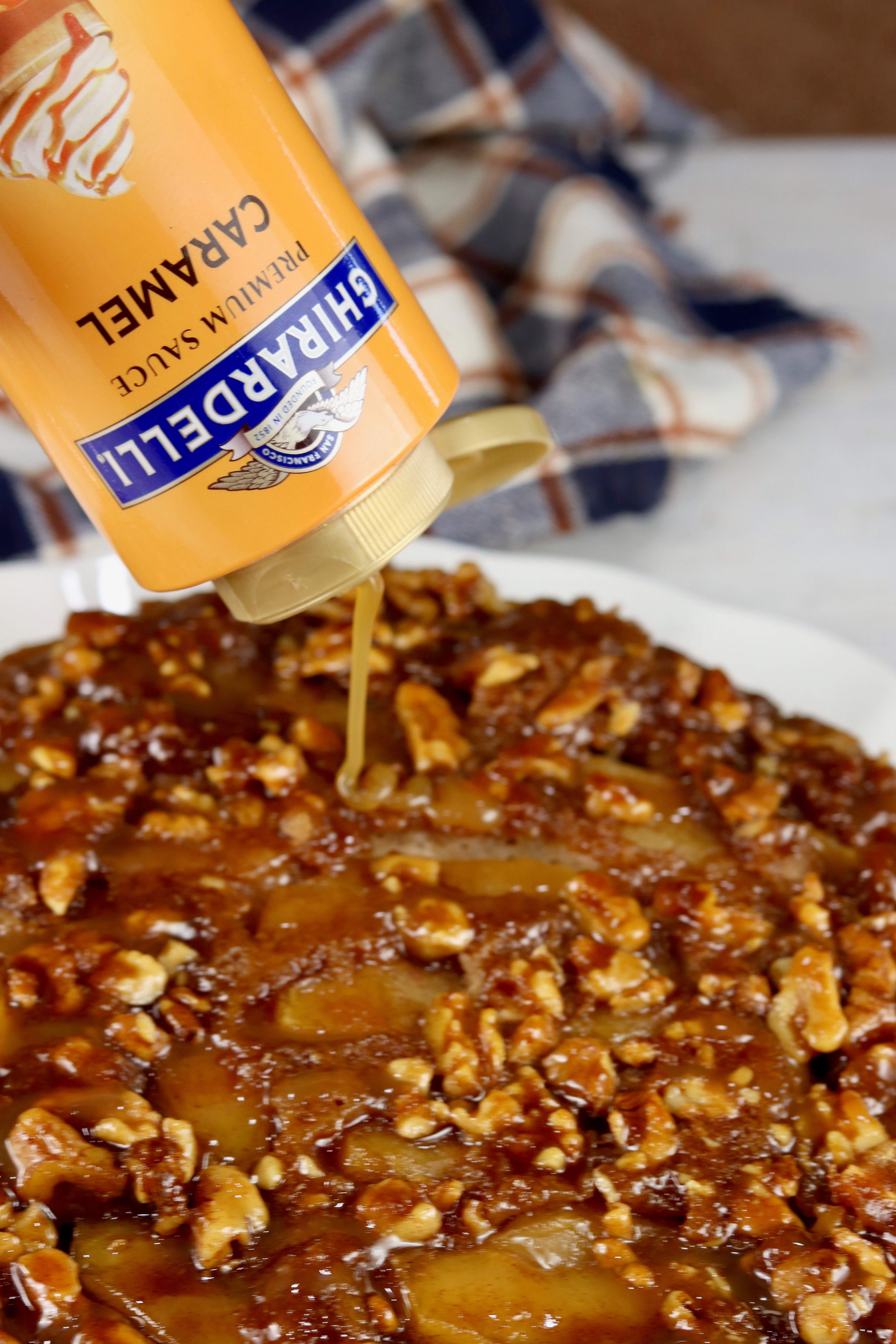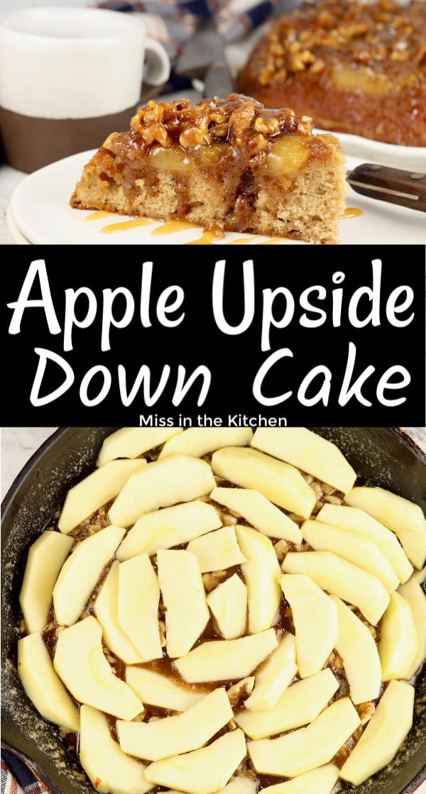 Apple Upside Down Cake is a delicious from scratch cake made in a cast iron skillet with caramelized walnuts and a fluffy spice cake. This is sure to be your new favorite dessert! So simple to make and perfect for the holidays or any occasion!