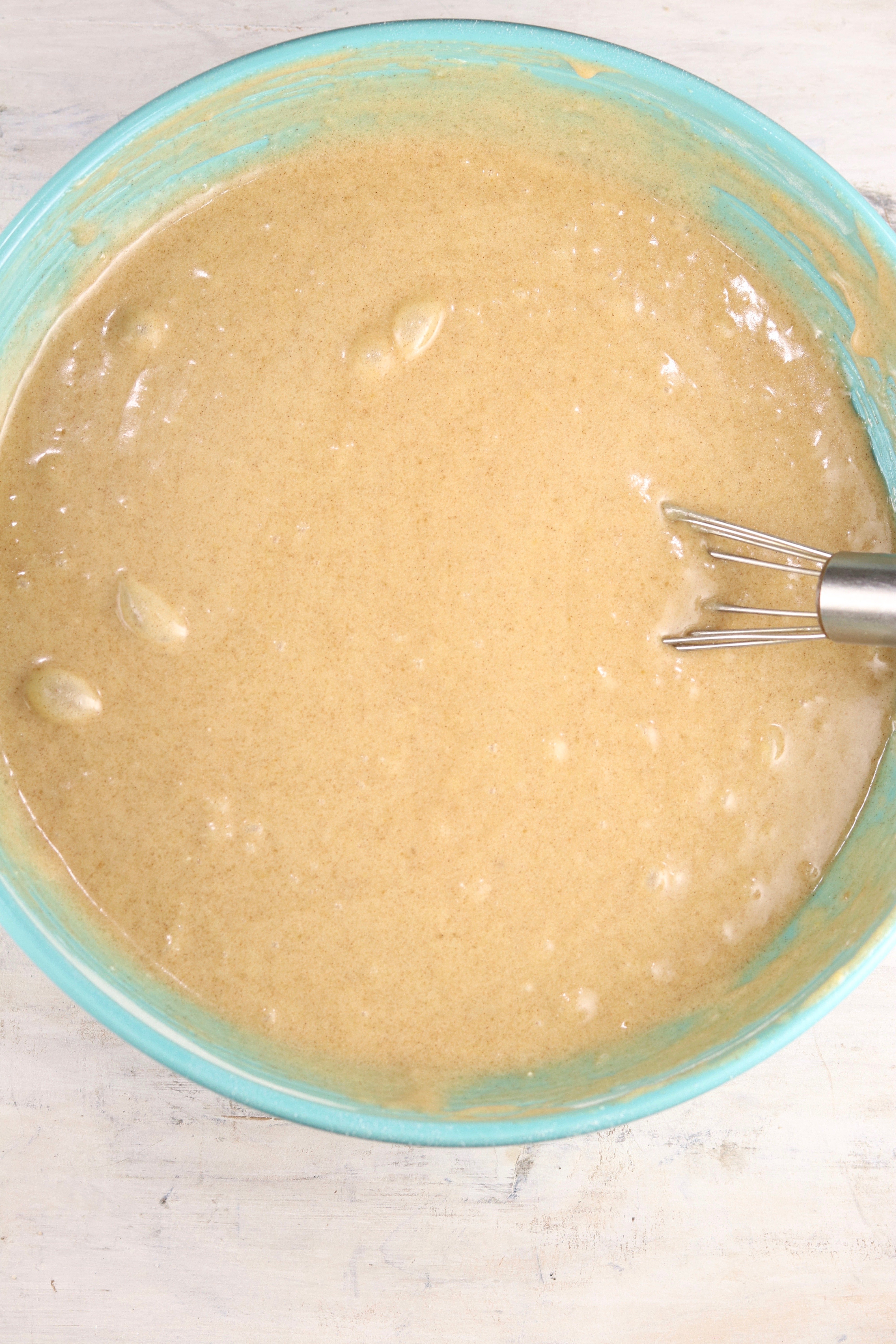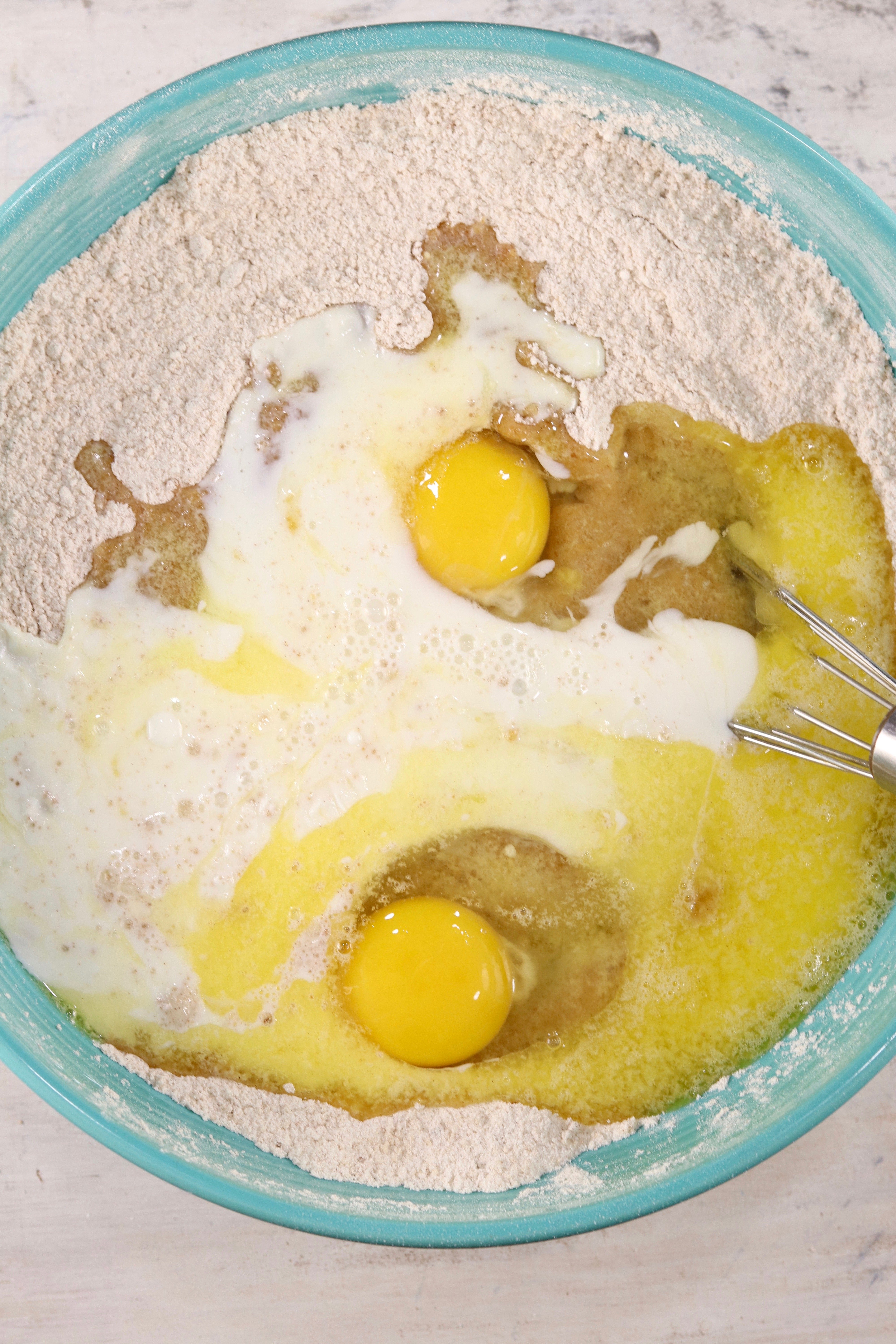 - Add milk, melted butter and eggs. Mix with a wire whisk until smooth.