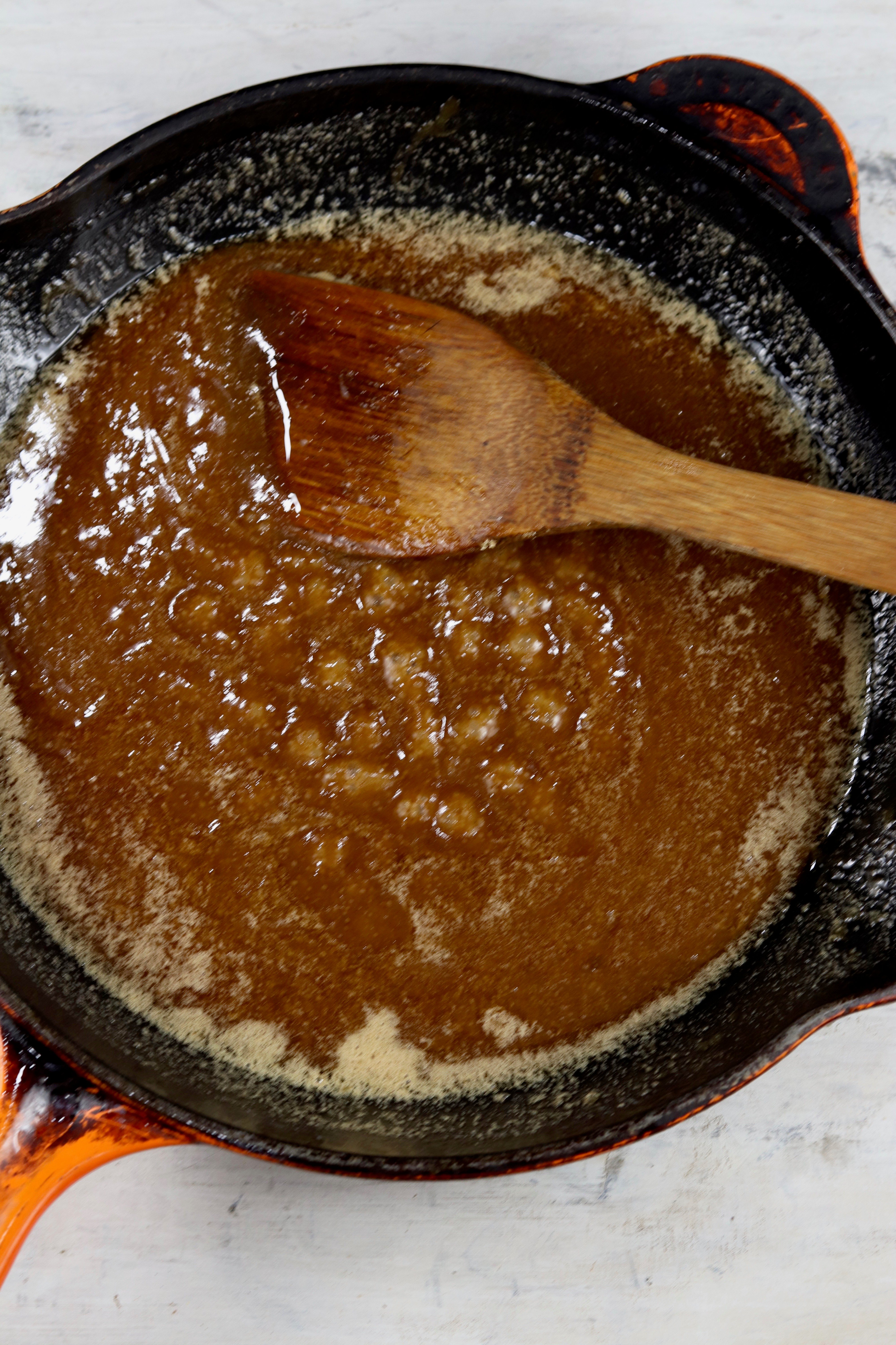 - Place skillet on a rimmed baking sheet to catch any overflow of the caramel layer.