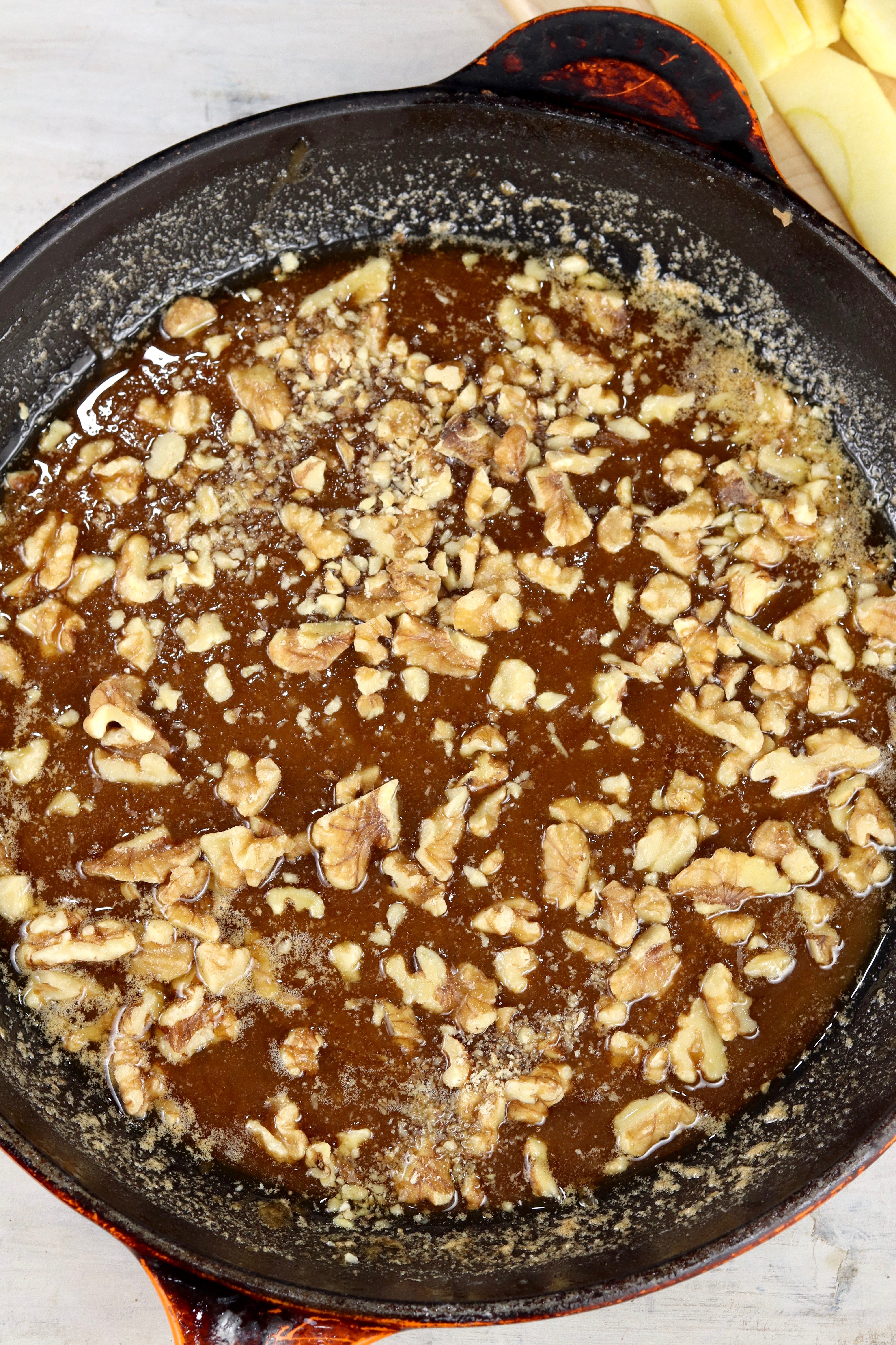 - Peel, core and thinly slice apples. Spread apples in a single layer over walnuts.