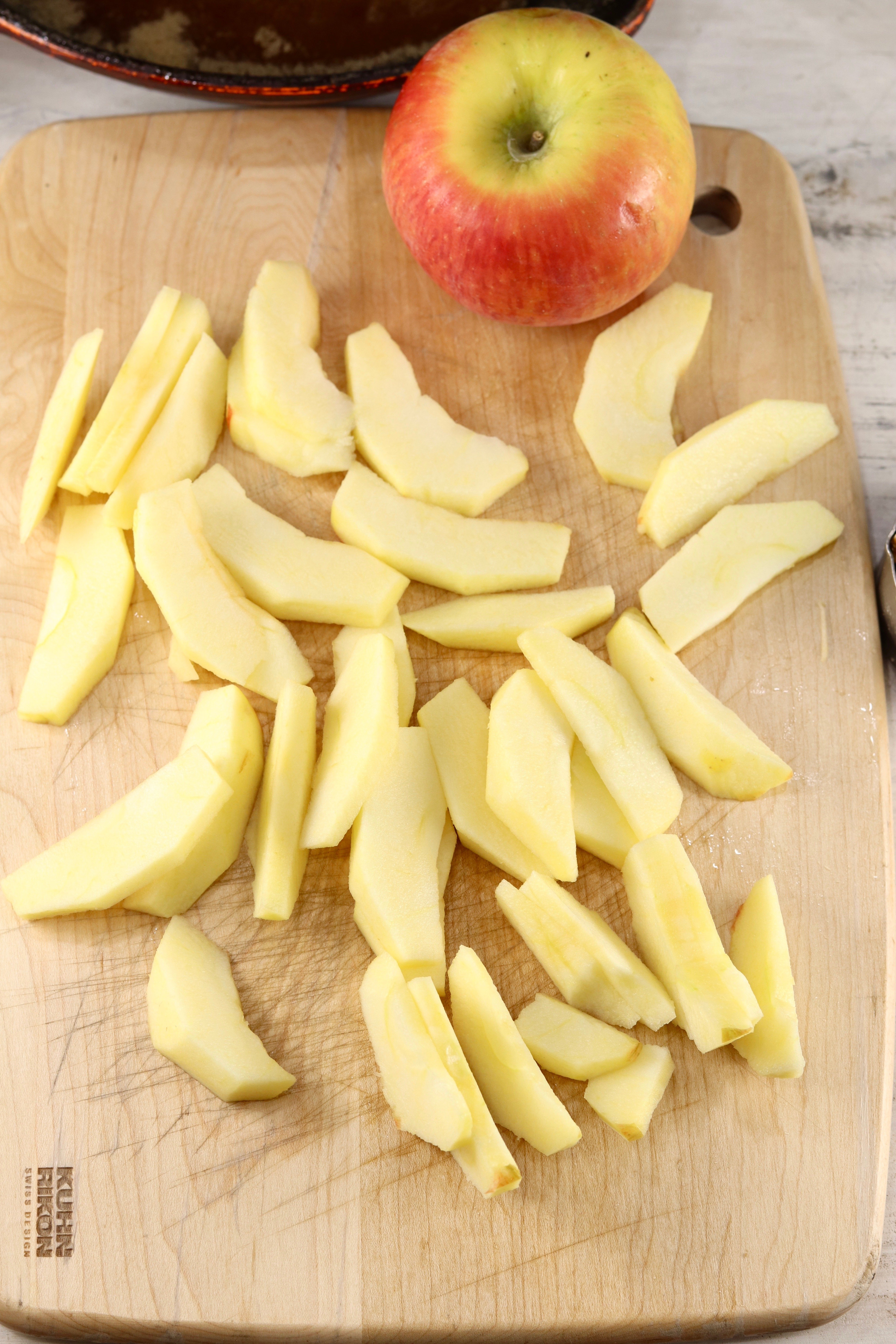 - Peel, core and slice 2 medium apples. Thin slices are best.