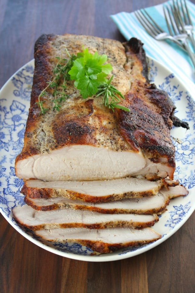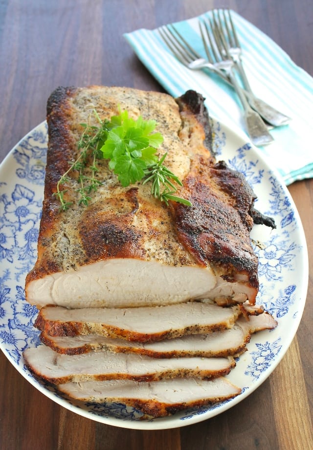The rest of the ingredients are simply salt, pepper and garlic. Easy I tell you! The bacon fat helps the pork loin brown and get a crispy coating while the inside stays juicy and moist.
