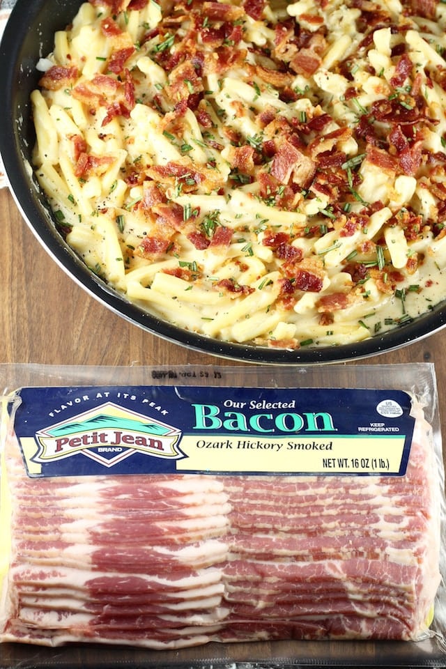 Really you can’t go wrong with bacon, pasta and cheese and you are just going to have to try this. I love that it comes together in about 30 minutes and it’s something the whole family can agree on.