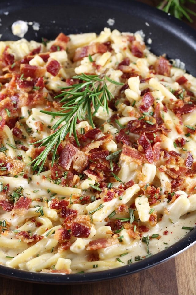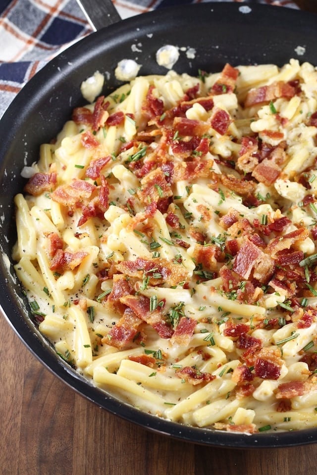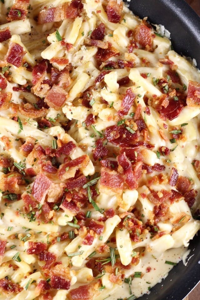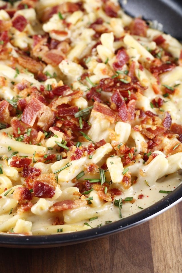 Mac and cheese might be my all- time favorite comfort food. It’s the one thing I would always eat growing up. This version is loaded with sharp white cheddar, fresh rosemary and tons of crispy bacon!
