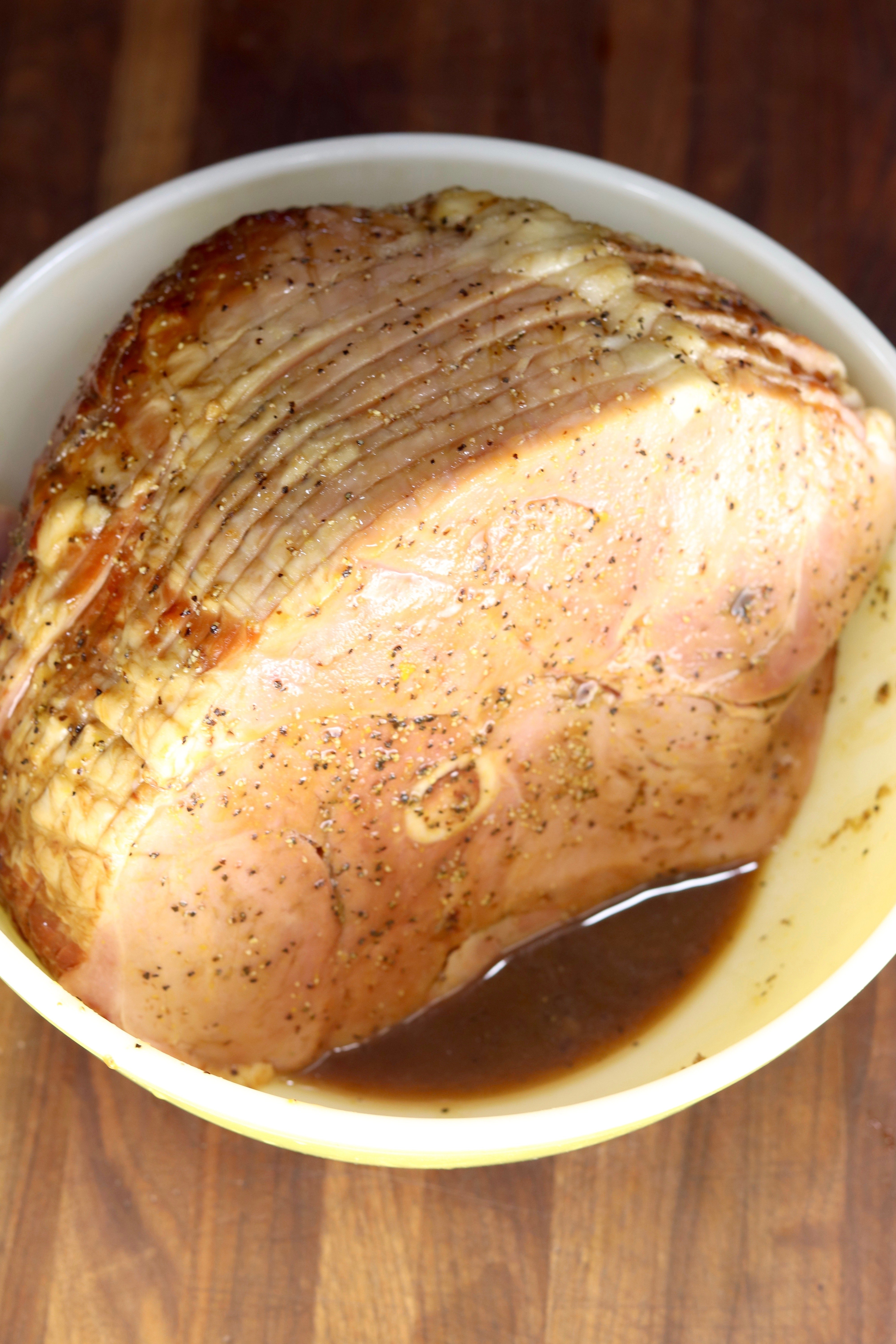 - Place ham in a large bowl. Pour glaze over ham, coating all sides and down into slices.