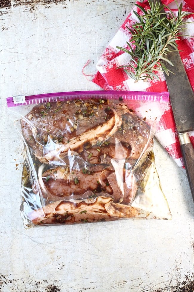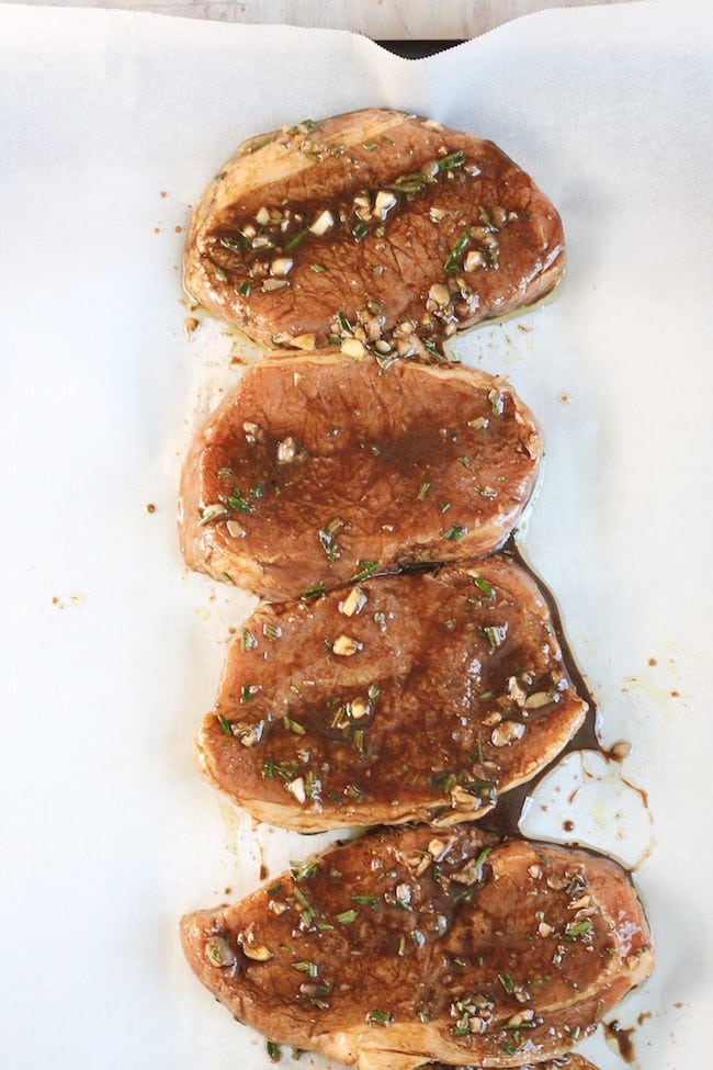 Just combine these simple ingredients in a bowl or zip top bag. Add your pork chops, cover or seal the bag and place in the refrigerator for an hour or two or overnight. There is so much flavor in this quick balsamic marinade. It would also work for beef or chicken.