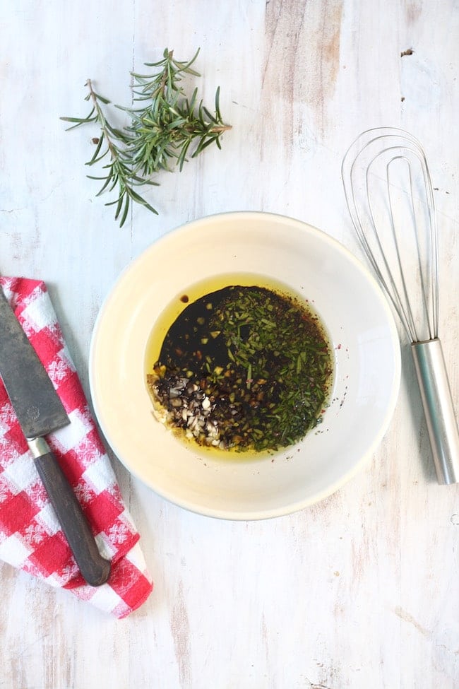 - Mix olive oil, balsamic vinegar, garlic, rosemary, salt and pepper together in a bowl.