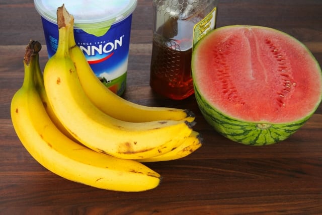 - Add banana, watermelon, yogurt and honey to a blender