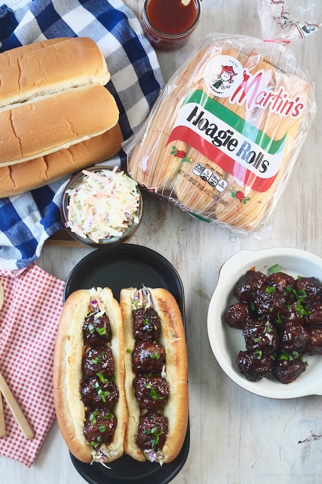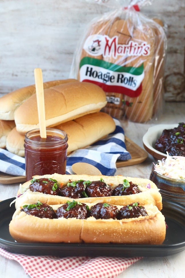 Martin’s Hoagie Rolls are the perfect start to my barbecue meatball hoagies. They are soft but yet sturdy enough to pile on fillings like sticky barbecue meatballs and every topping imaginable.