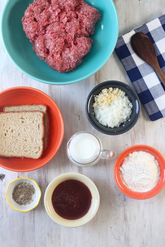 - Add ground beef to a large mixing bowl. In a small bowl, add milk and bread and mix together until smooth, add to ground beef along with the beaten egg, onion, garlic and salt and pepper. Mix well.