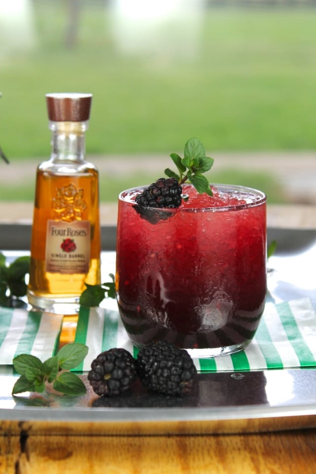 I’m impatient so I picked up a package of fresh blackberries at the market. I also added some peppermint plants to my container garden this weekend. Now all I needed for a mint julep was the Kentucky Bourbon. Well, lucky me received a few samples of Four Roses Single Barrel Kentucky Straight Bourbon Whiskey to try this week. I love my job.
