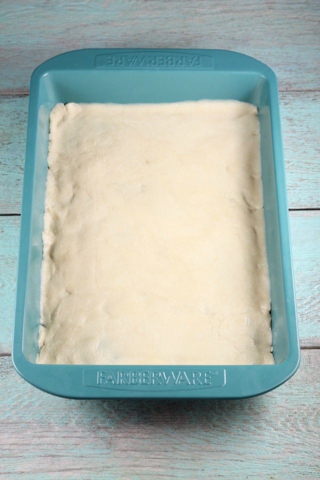 Start by pressing the Sugar Cookie Dough into the bottom of a baking pan and pop it in the oven.