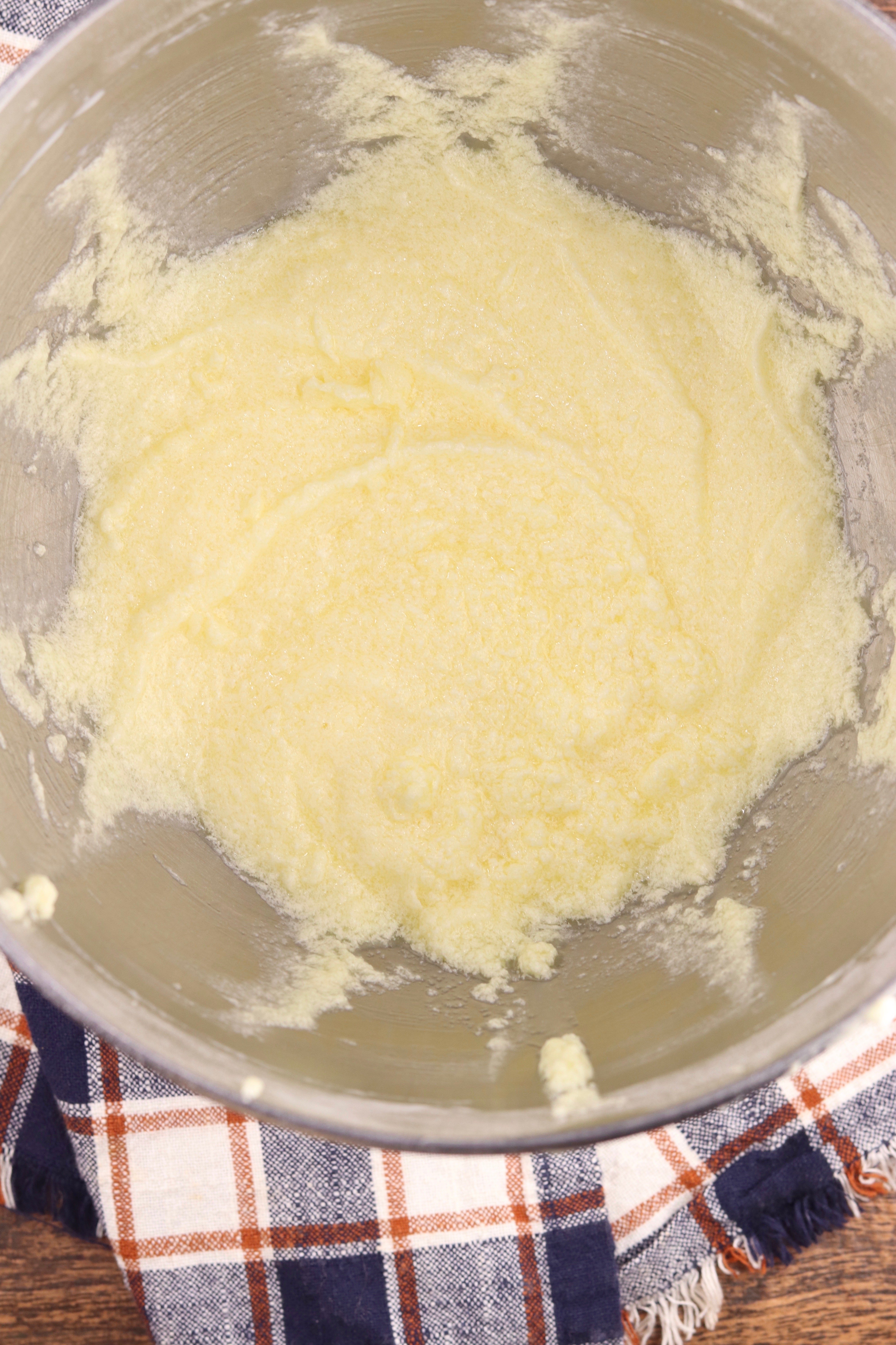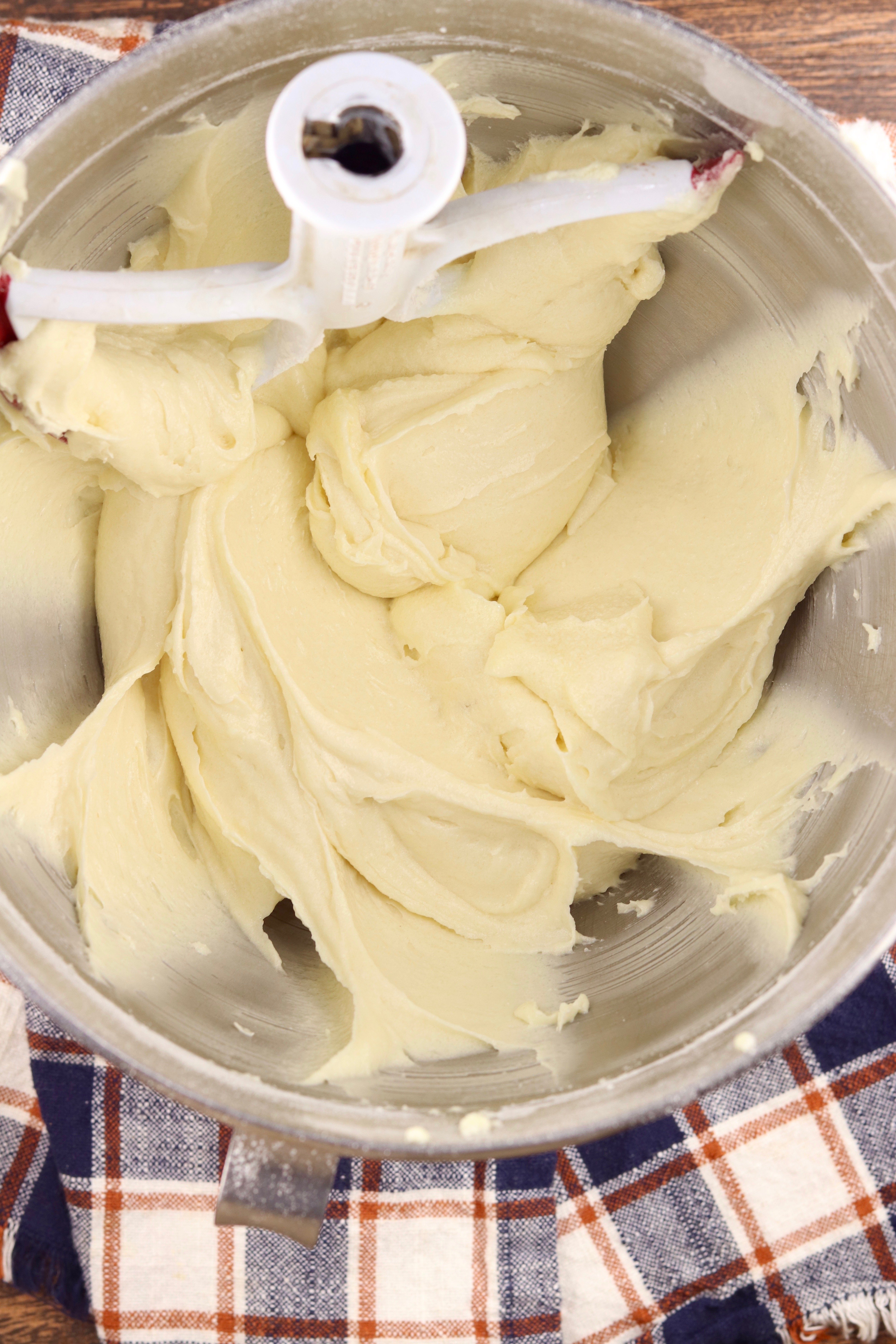 - To make the cake, combine the butter and sugar together in a large bowl. Beat with an electric mixer until fluffy crumbs form. Add the eggs and almond extract and beat until smooth. Add the milk and beat on low speed to combine. Add the flour, baking powder and salt. Beat until just combined.