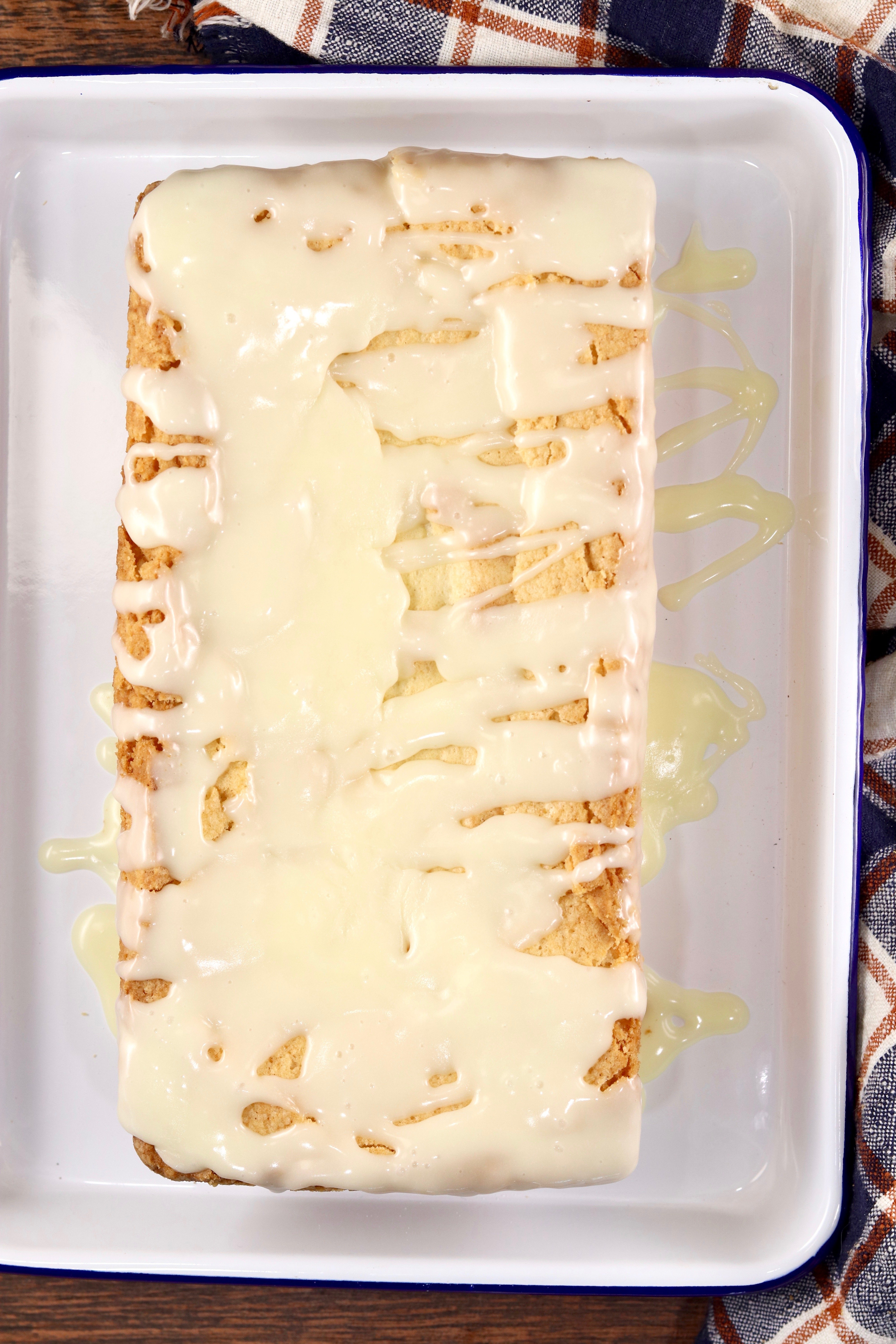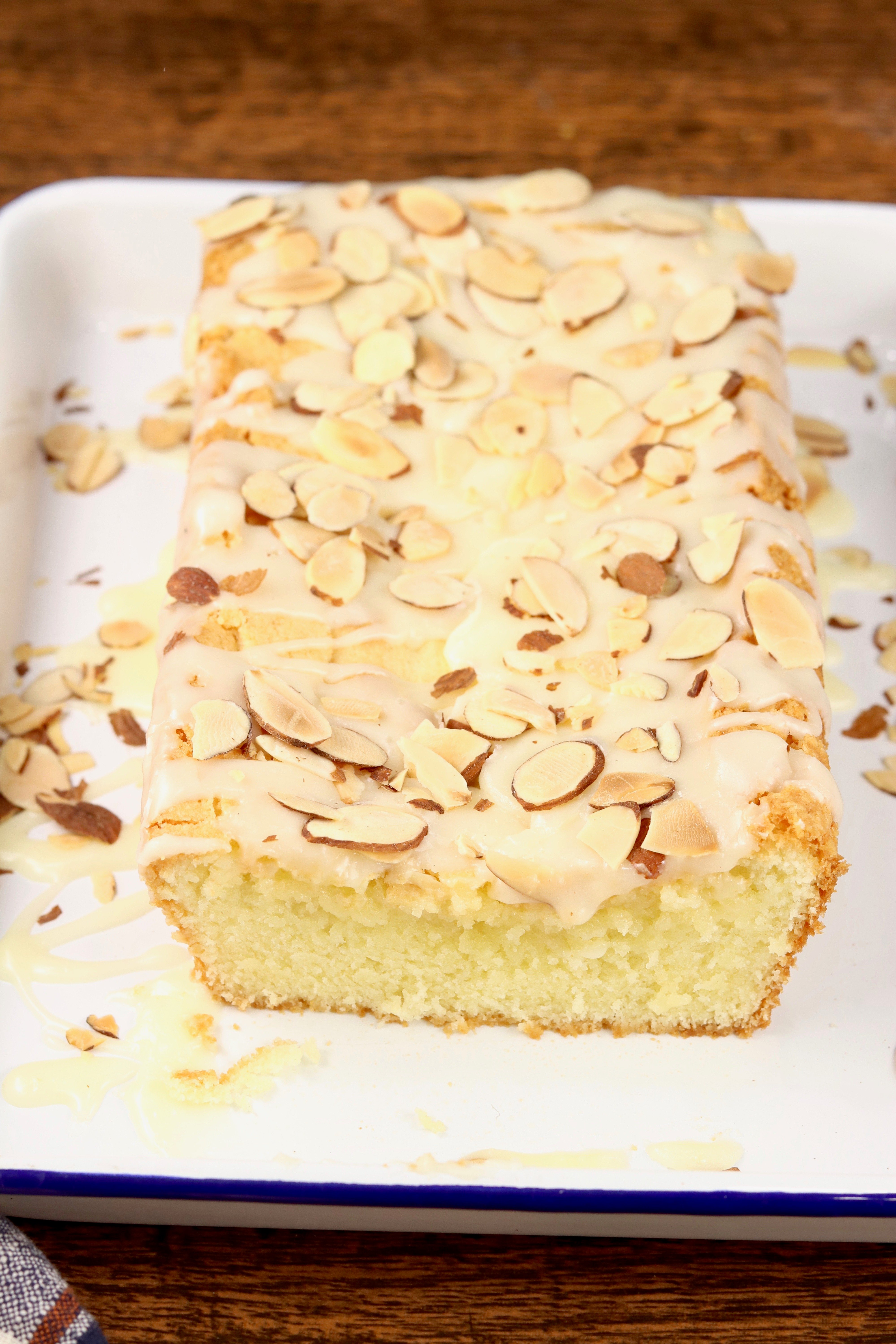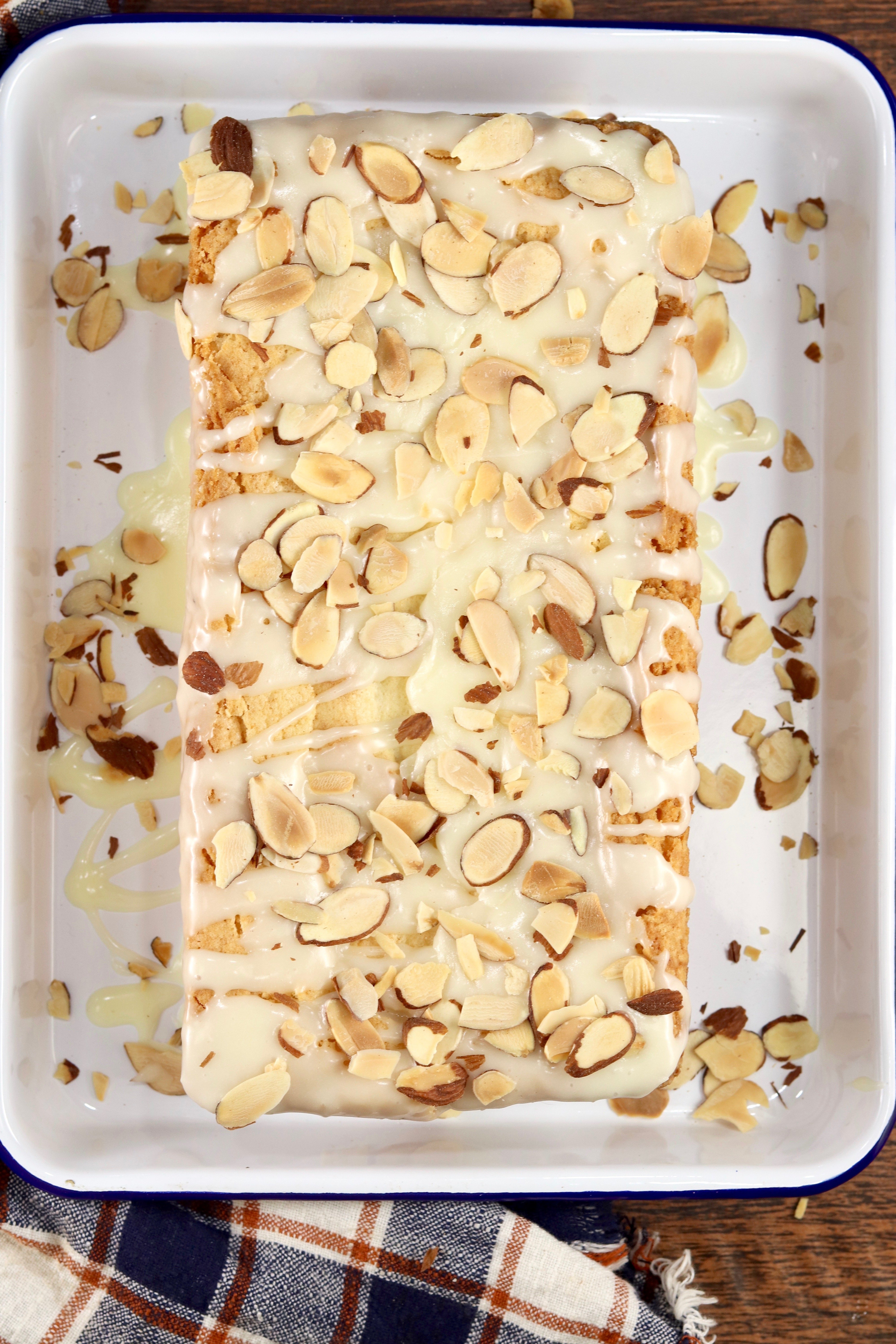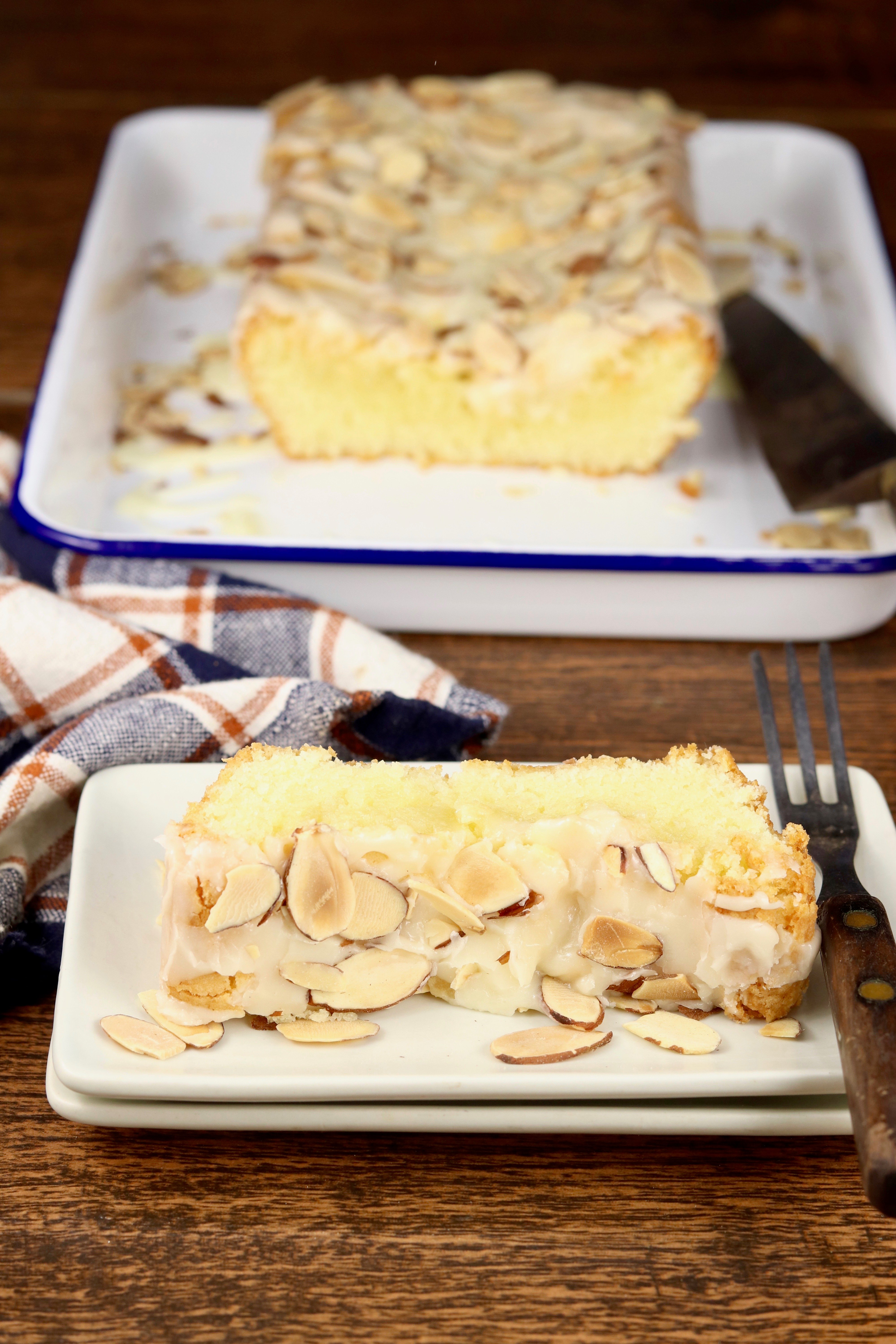 - To Glaze the cake: melt butter in a small bowl and stir in powdered sugar, milk and almond extract. Whisk until smooth and drizzle over cake.