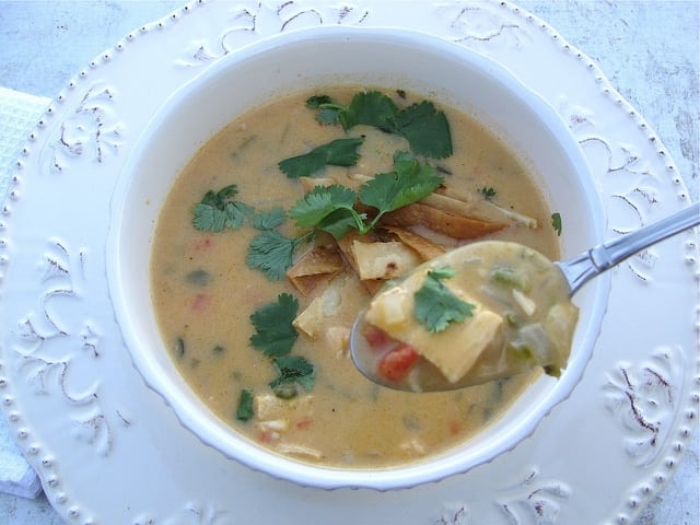 Cheddar Cheese Soup with Chicken & Peppers is filled with poblano peppers, red peppers, jalapeno, onions, chicken, potatoes, and the rich broth is finished off with cheddar cheese which balances out the spicy peppers. Y’all know I can’t handle the heat, so believe me when I say, you get lots of flavor but not too much heat. I garnished it with a few fried tortilla strips and fresh cilantro.