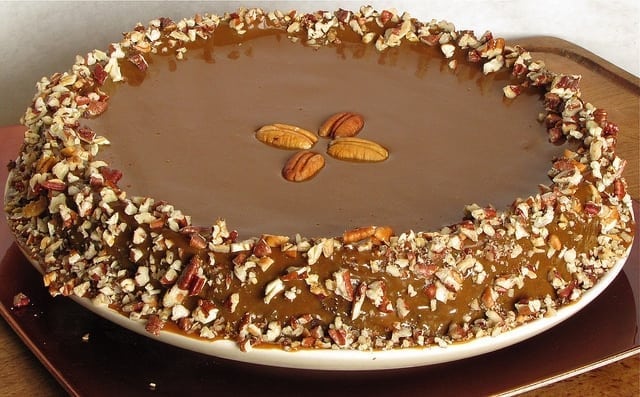 - Meanwhile stir dulce de leche and heavy cream together and heat at 30 second intervals in the microwave, stirring in between until smooth and combined. Pour over cheesecake coating top and sides. Sprinkle pecans around the edge and sides. Place pecan halves in center.