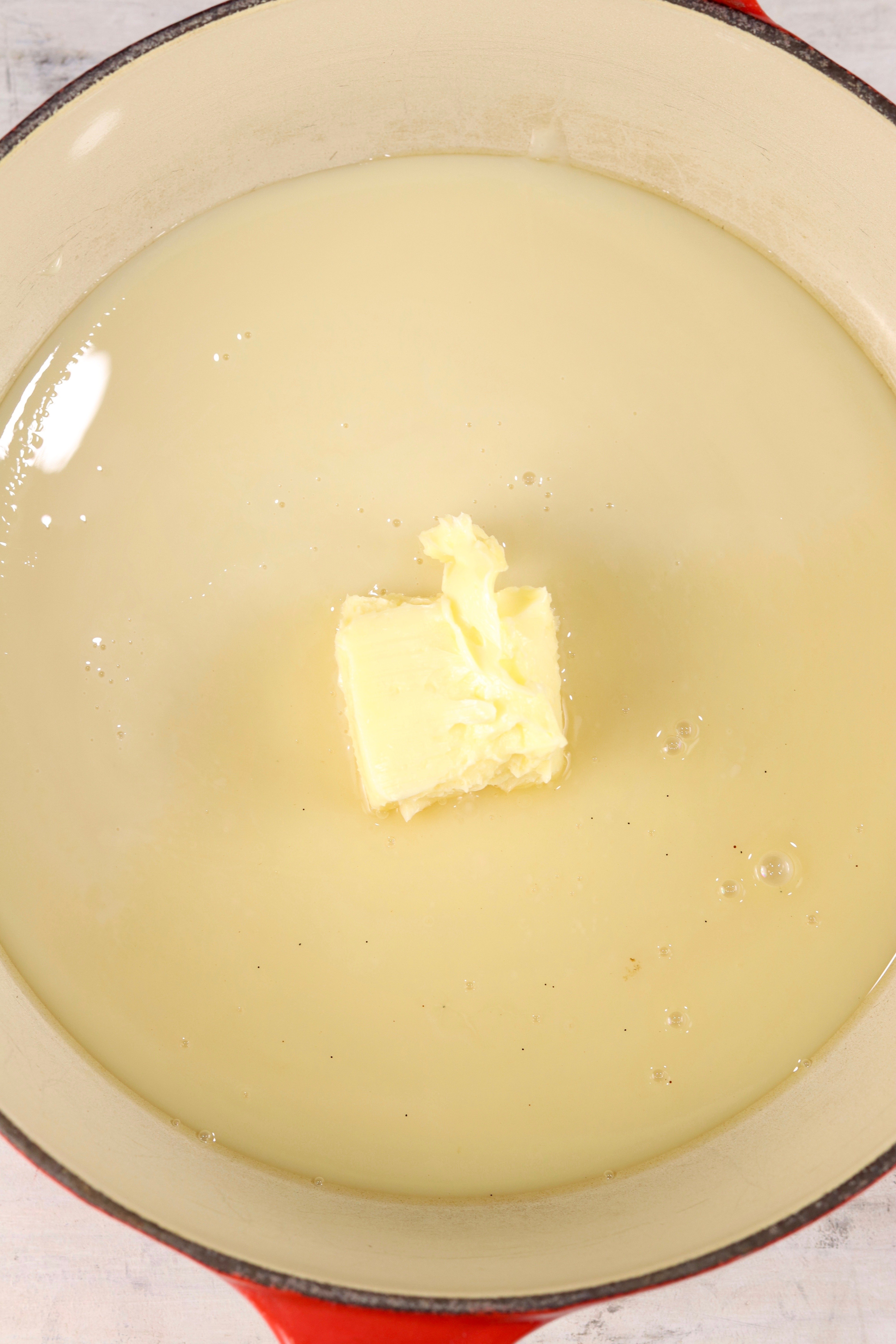 - In a saucepan, add sweetened condensed milk and 2 tablespoons butter. Cook over medium heat, bring to a boil and cook 5 minutes, stirring constantly.