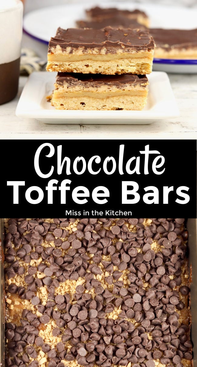 Chocolate Toffee Bars are rich and delicious. A really simple dessert for holidays and family get togethers. A cookie crust topped with a gooey toffee layer and lots of chocolate!