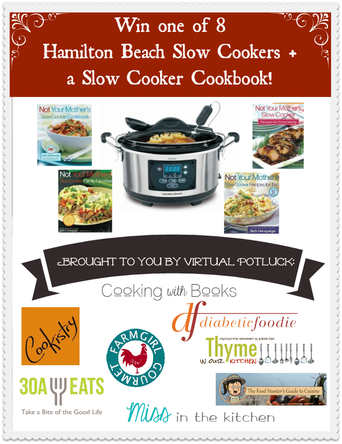 Be on the lookout for 7 other fantastic slow cooker recipes from Farmgirl Gourmet, Cookistry, Time in Our Kitchen, Diabetic Foodie, 30A Eats, Cooking with Books, & Food Hunter’s Guide to Cuisine.
