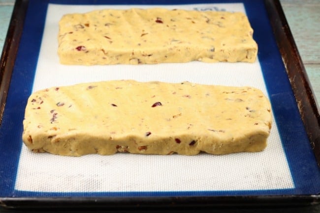 They key to that crunchy goodness comes from baking the biscotti twice. It is an extra step beyond your average cookie recipe but they are totally worth it! First you shape the dough into small loaves and bake it.