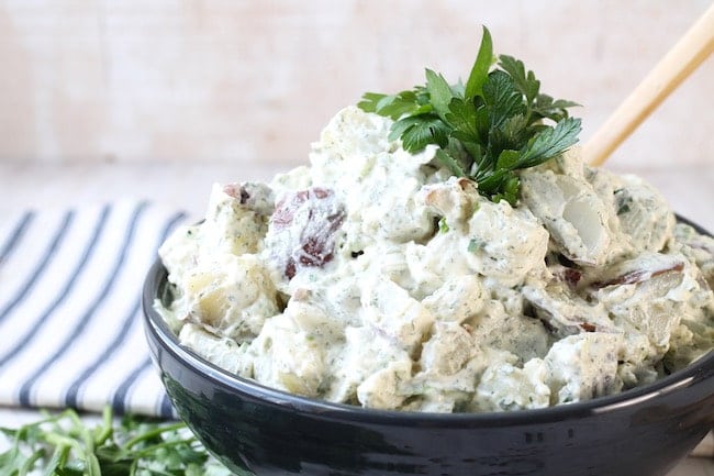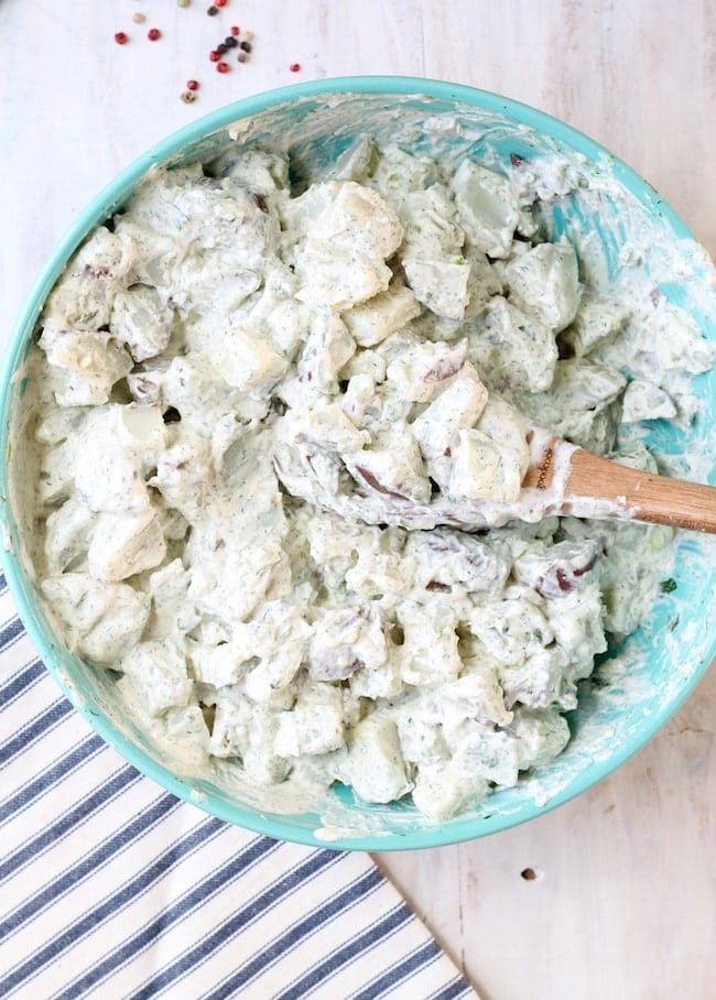 We had some steaks out to grill for Friday night and I was so glad I put this potato salad together. It was the perfect side dish and I will be making it again and again this summer. Did I mention that it is one of the easiest summer side dishes that you can make? It really is.