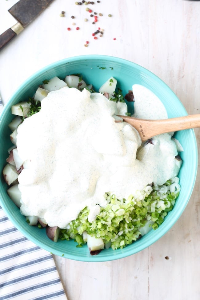 - Add potatoes, green onions, parsley and dressing into a large bowl and mix to combine.
