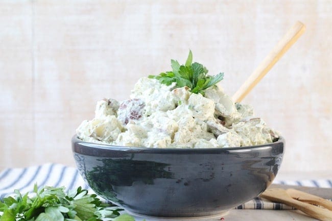 I think even the picky eaters will like this easy potato salad. I add just a few mild, green onions, there are no big chunks, no boiled eggs and the dressing is just so creamy and delicious. It’s a crowd pleaser for sure.