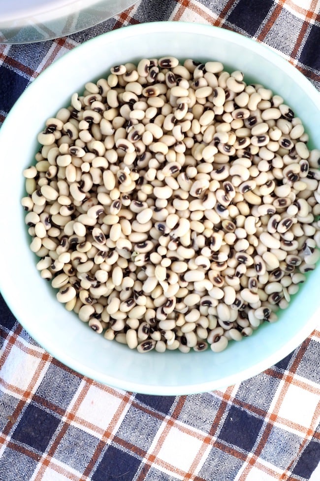 - Place black eyed peas into a bowl and cover with cold water. Set aside for 1 hour.