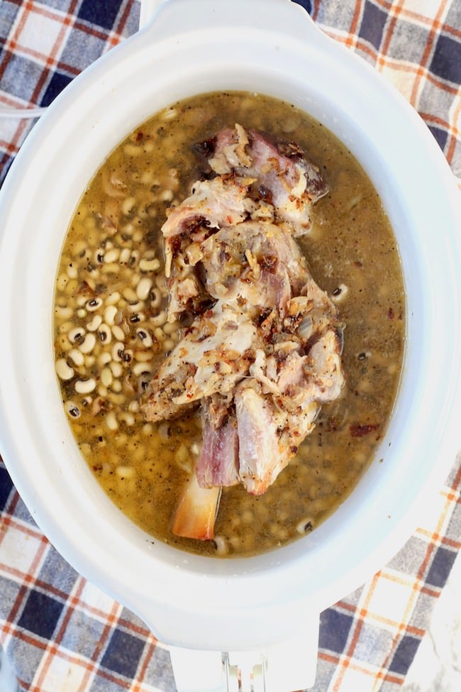 Crock Pot Black Eyed Peas are true southern comfort food! Loaded with bacon, onions and smoked turkey and slow cooked to perfection with a ham bone. The most delicious start to a new year!