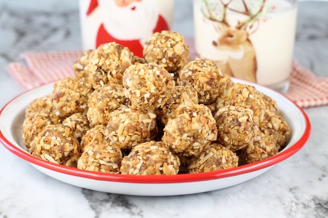 Crispy Date Balls are a holiday staple and so easy to make! Filled with sweet and chewy dates, pecans, Rice Krispies and then rolled in toasted coconut. Your family is sure to love these easy no bake holiday treats.