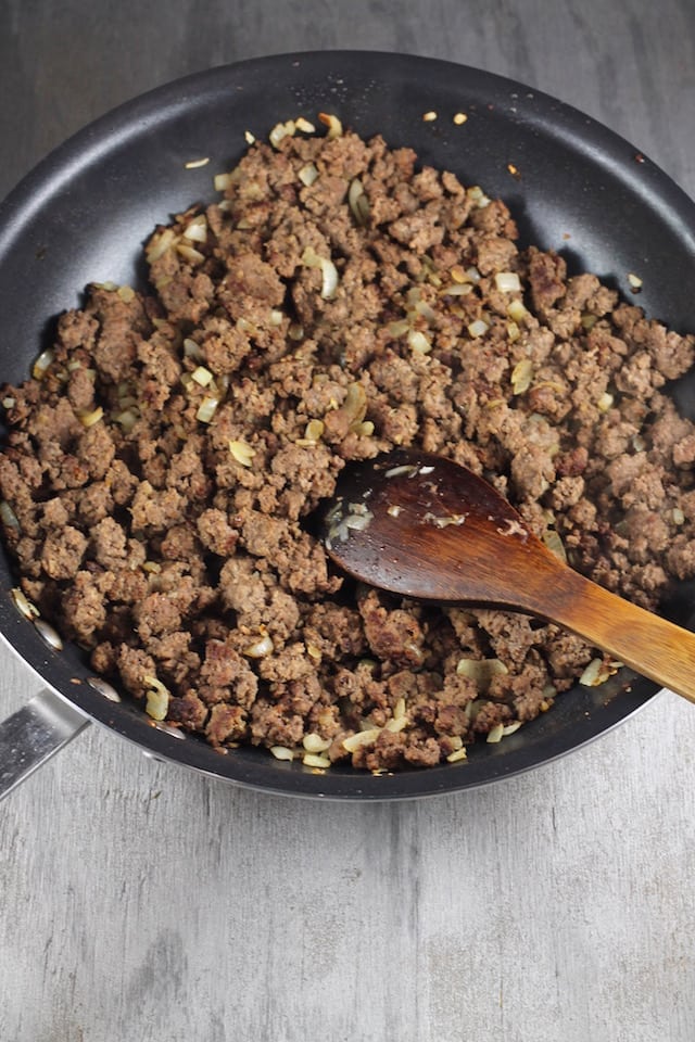 - Add ground beef to a large skillet and place over medium-high heat. Season with garlic, salt and pepper. Cook, stirring until it starts to brown. Add onions and continue to cook until onions are softened and ground beef starts to get crispy.