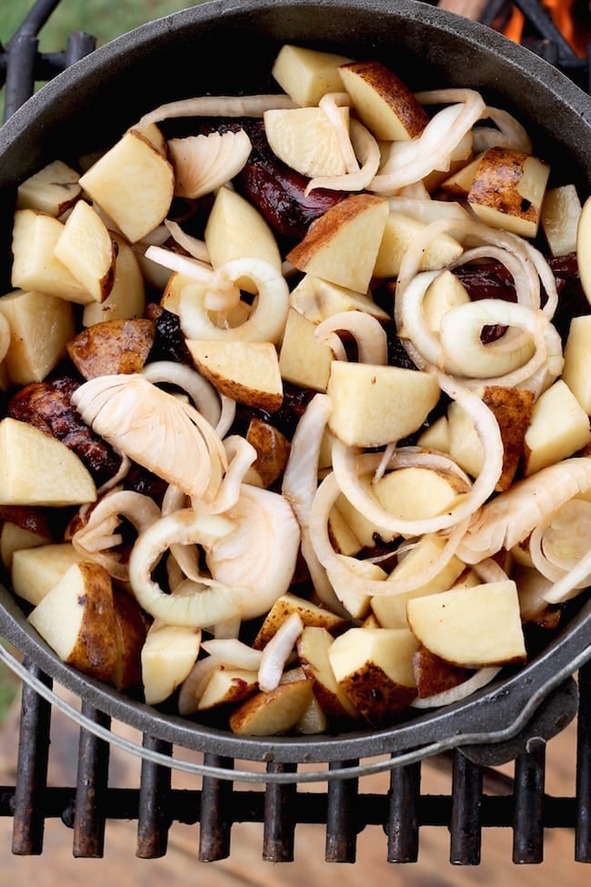 Add potatoes and onions and coat with barbecue mixture. Remove to a bowl with a slotted spoon.