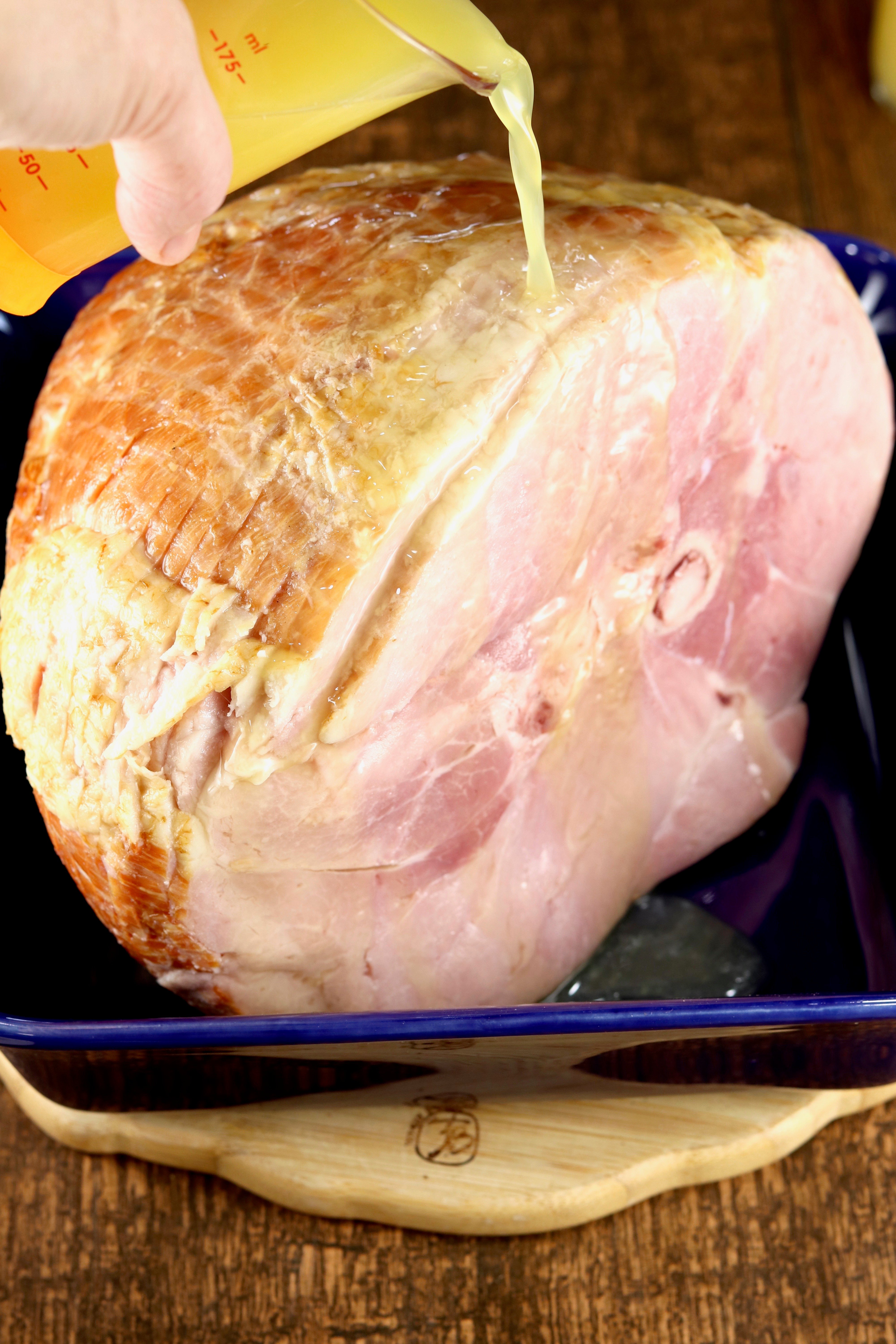 - Place ham in a baking dish or large roasting pan. Pour pineapple juice over ham, down between the slices.