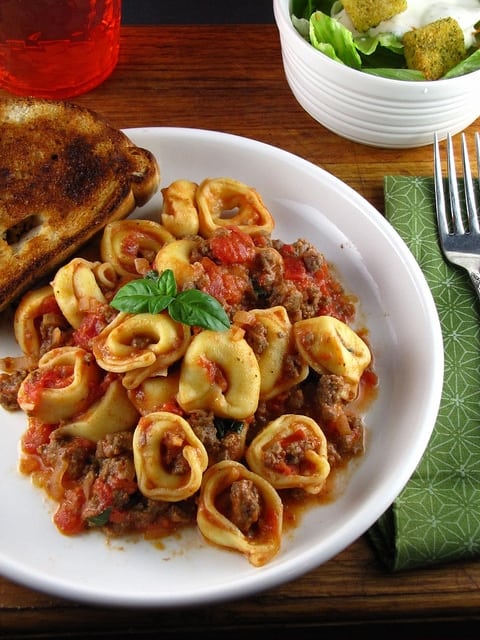 My middle son has basketball practice at varying times in the evenings and so I usually need something quick to feed him the moment he walks in or something that will taste just as good if it has to wait awhile. I picked up some tortellini from the store and made a quick meat sauce, added a salad and some French bread and it couldn’t have been easier!