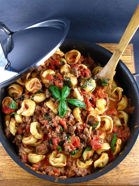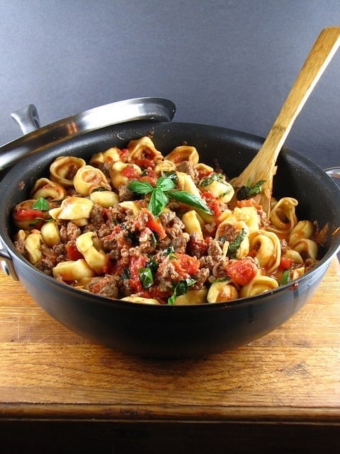 - Return browned ground beef to the pan with the tomatoes, stir in Parmesan, half and half and tortellini. Raise to medium heat and cover with lid. Cook for 5 minutes, stir well, lower heat to medium-low and cover. Cook an additional 5 to 8 minutes or until tortellini are heated through.