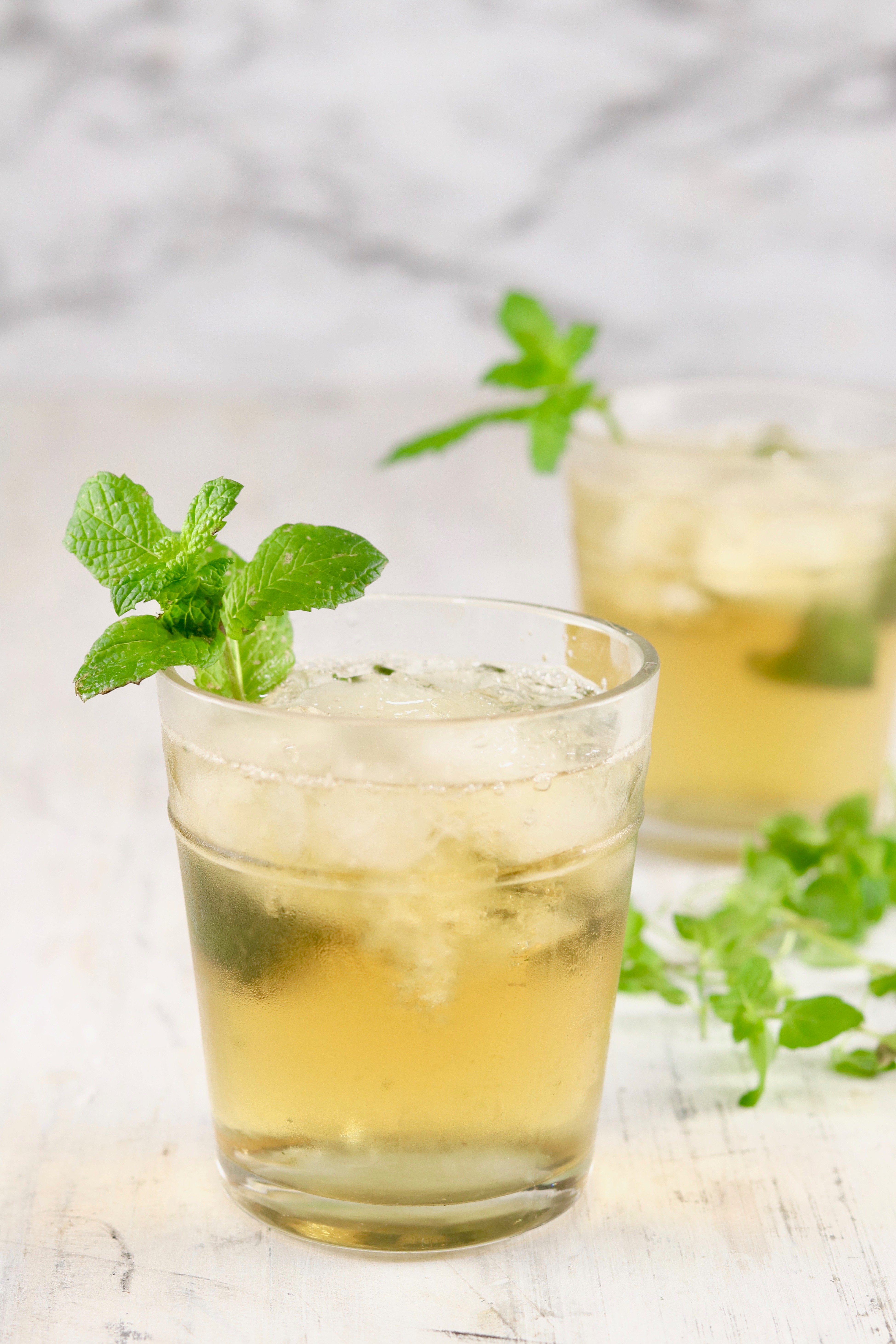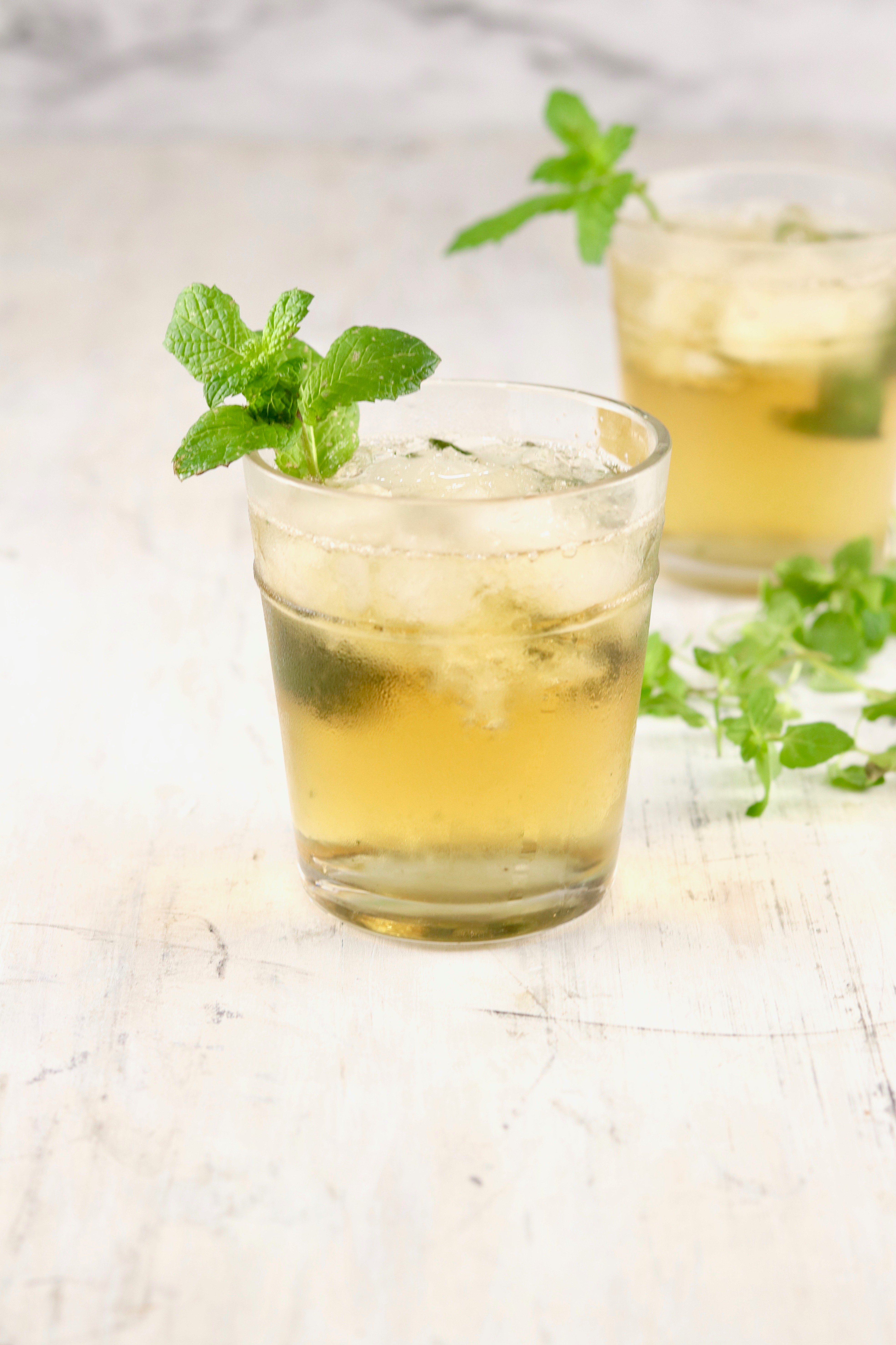 - Add 3 or 4 fresh mint leaves to each glass and muddle slightly.