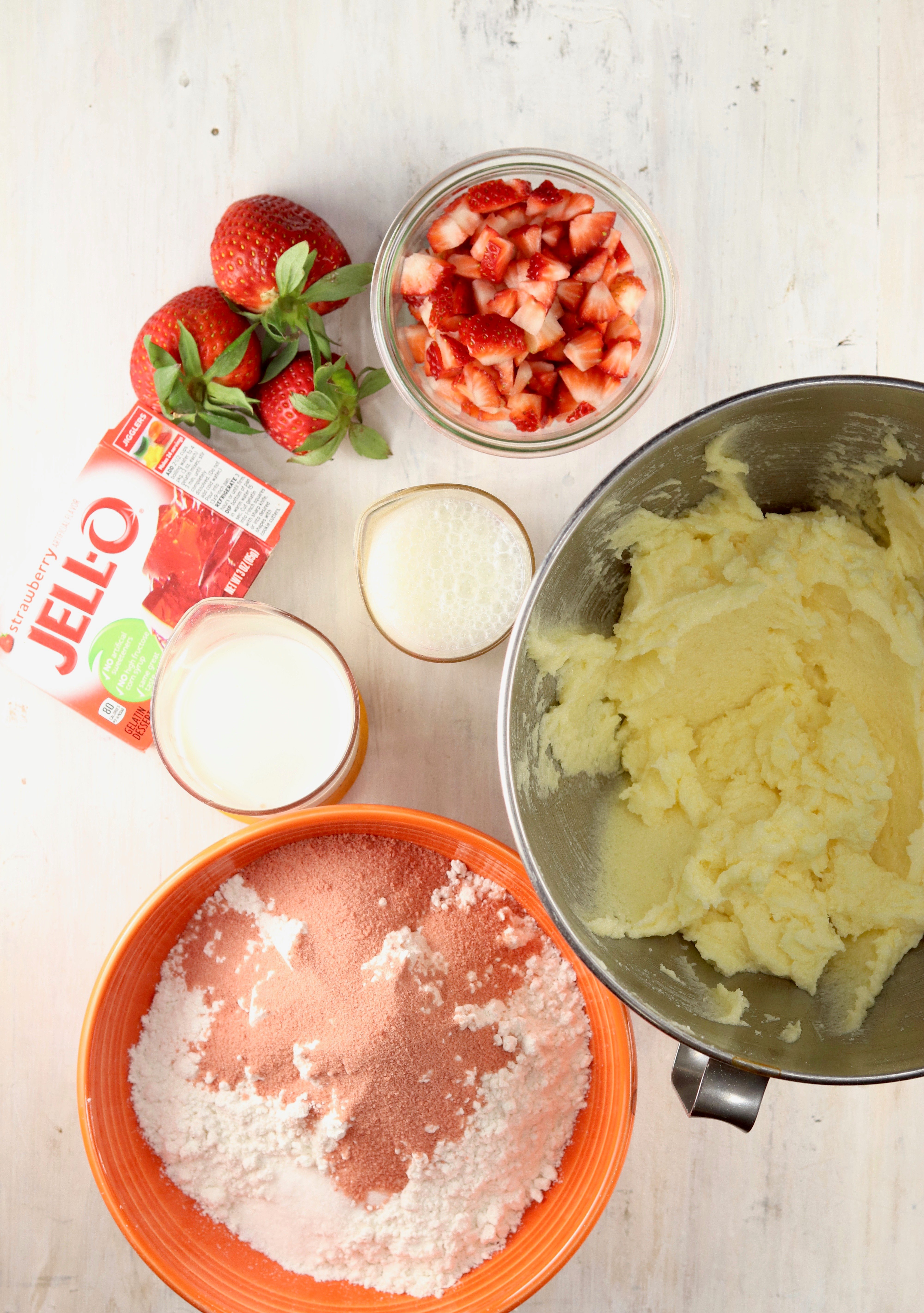 - In a separate bowl, whisk together flour, Jello powder, baking soda and salt.