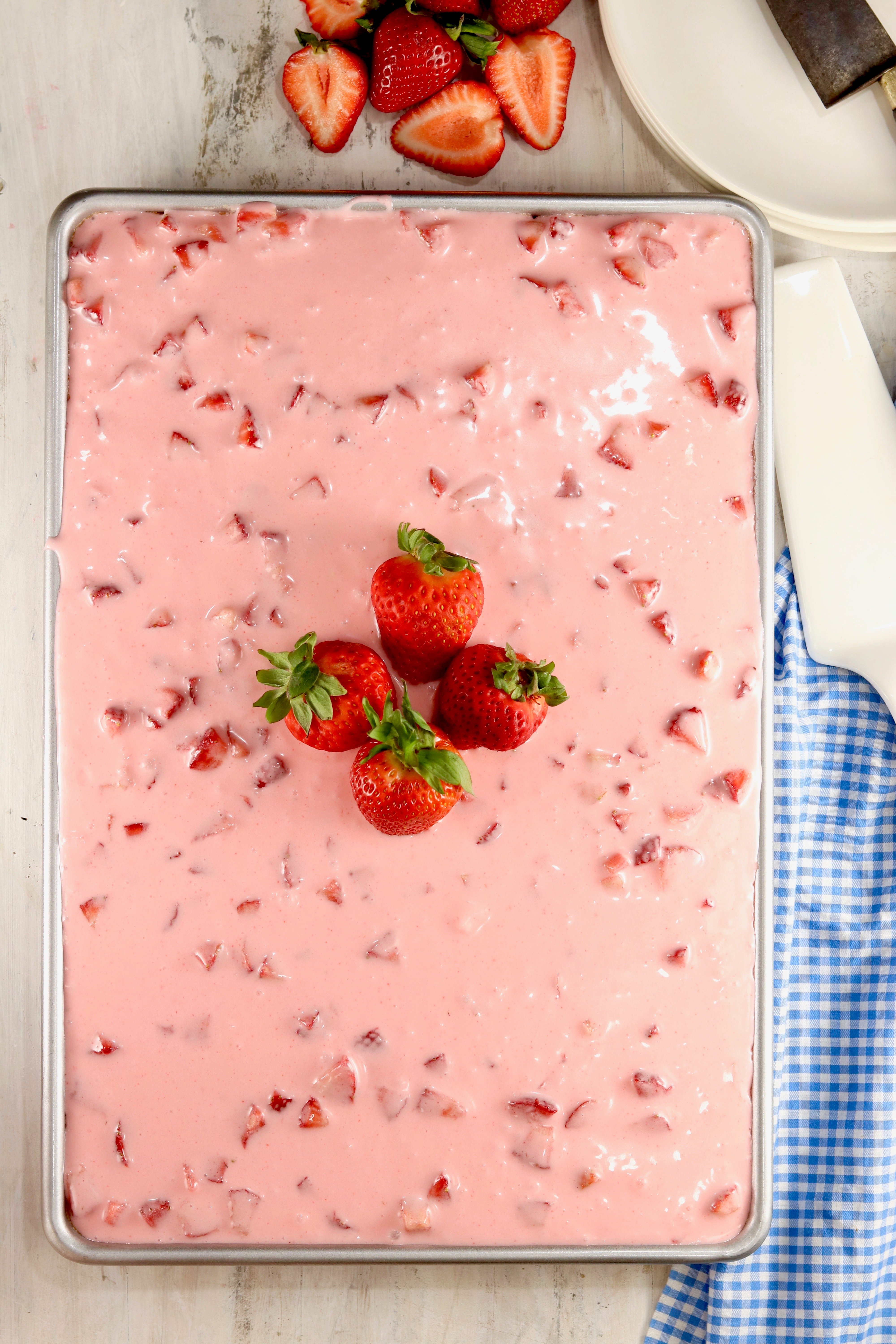 - Fold in strawberries. Spread over cooled cake.