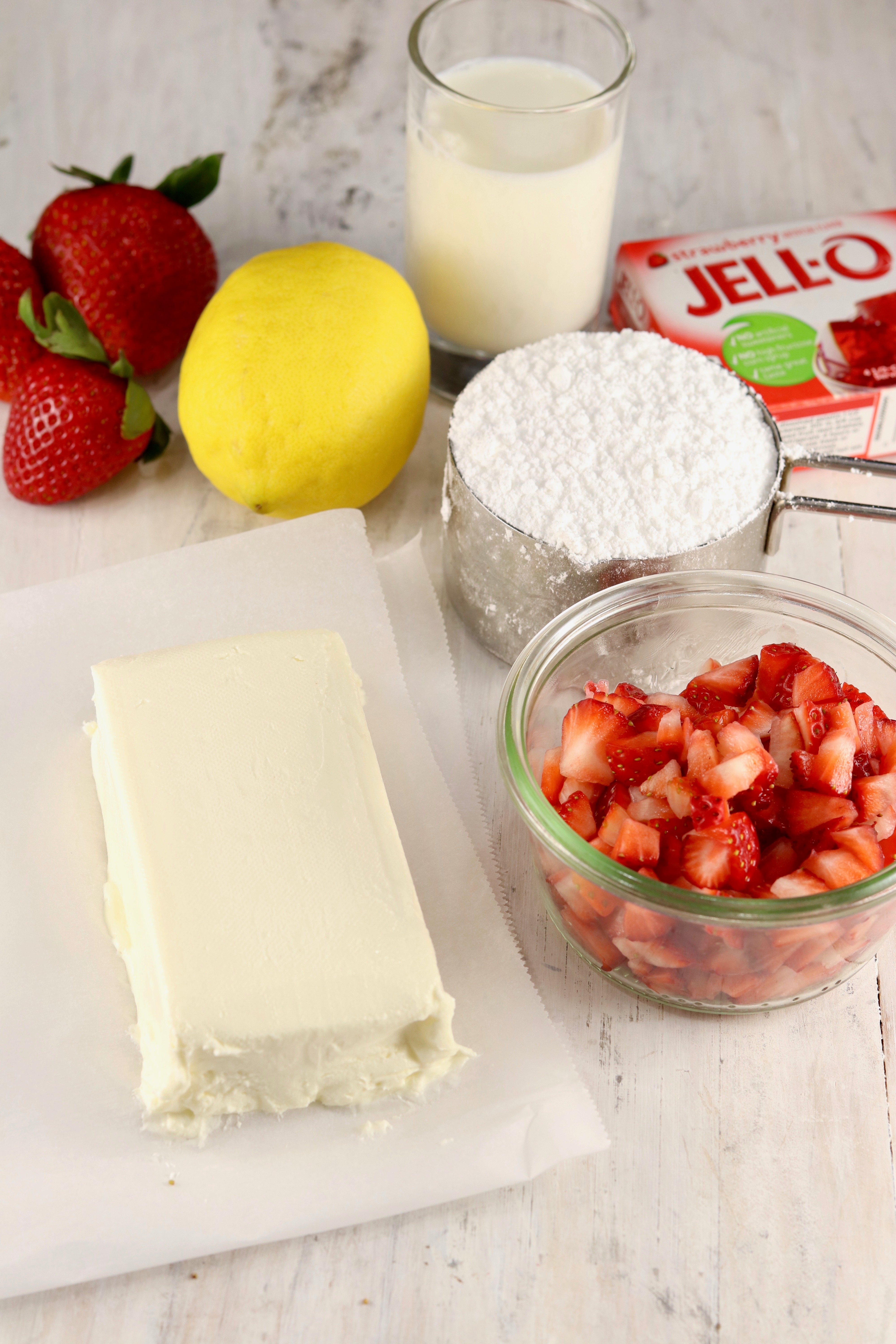 - Beat cream cheese, powdered sugar and Jello powder until smooth and creamy. Add lemon juice and beat until combined. Add milk and beat until smooth. Fold in strawberries.