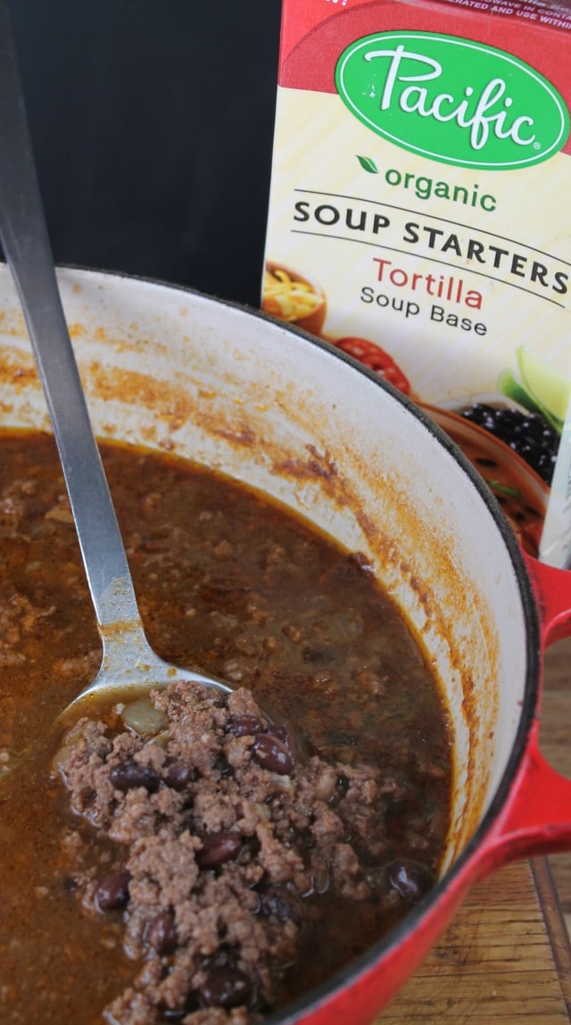 I used Pacific Foods Tortilla Soup Base and it made the best chili! I didn’t really know what to call this. Tortilla soup is generally made with chicken and since I added ground beef and black beans this seemed more like chili. Chili Soup, Soup Chili, I don’t know. It’s not as tomato-y as regular chili, so I settled on Taco Chili. Call it what you will, it’s a darn good bowl of comfort food!