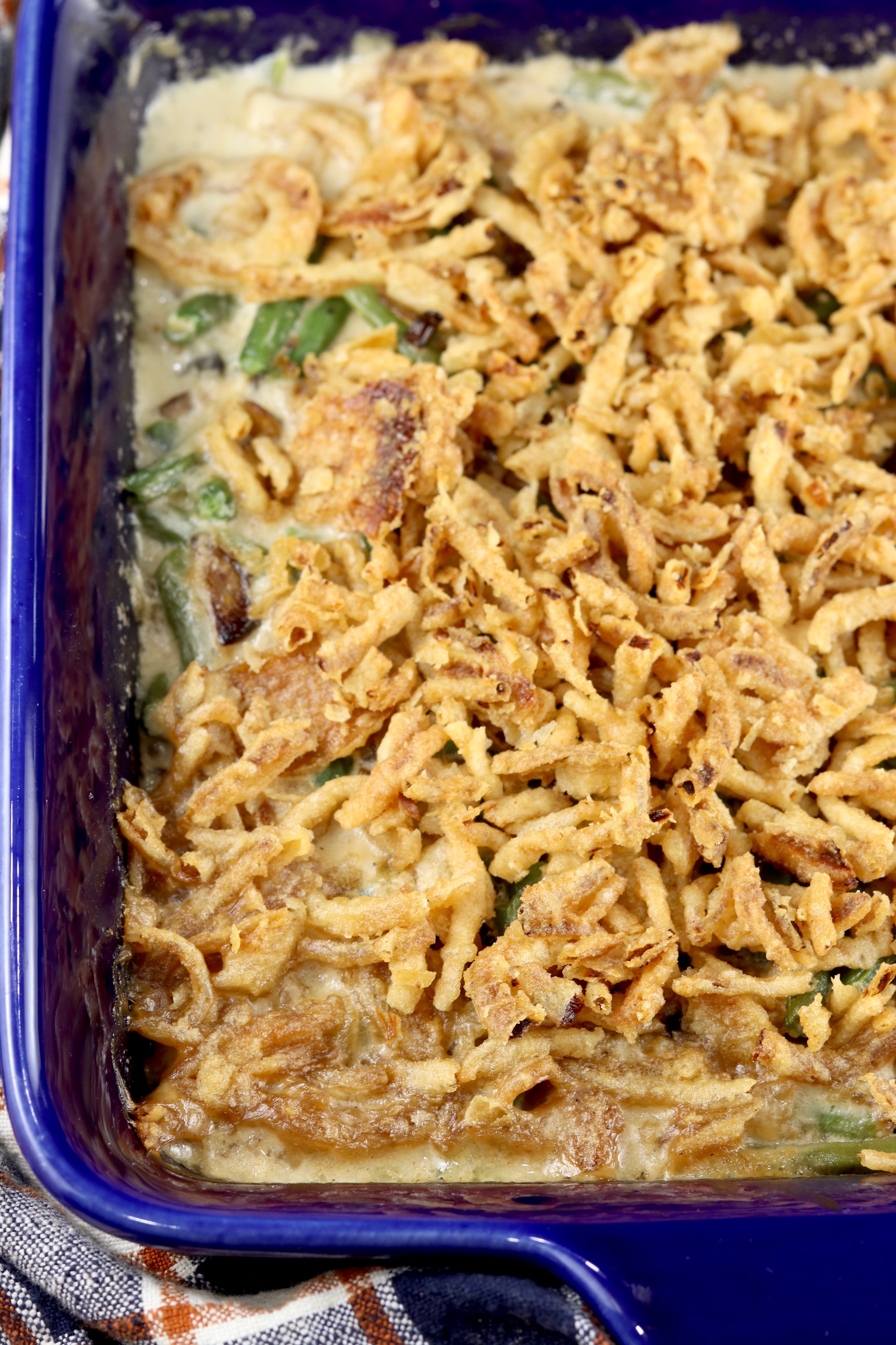 Green Bean Casserole is the classic everyone loves. Our version is made from scratch with fresh vegetables and a homemade cream sauce and topped with our favorite crispy French fried onions.