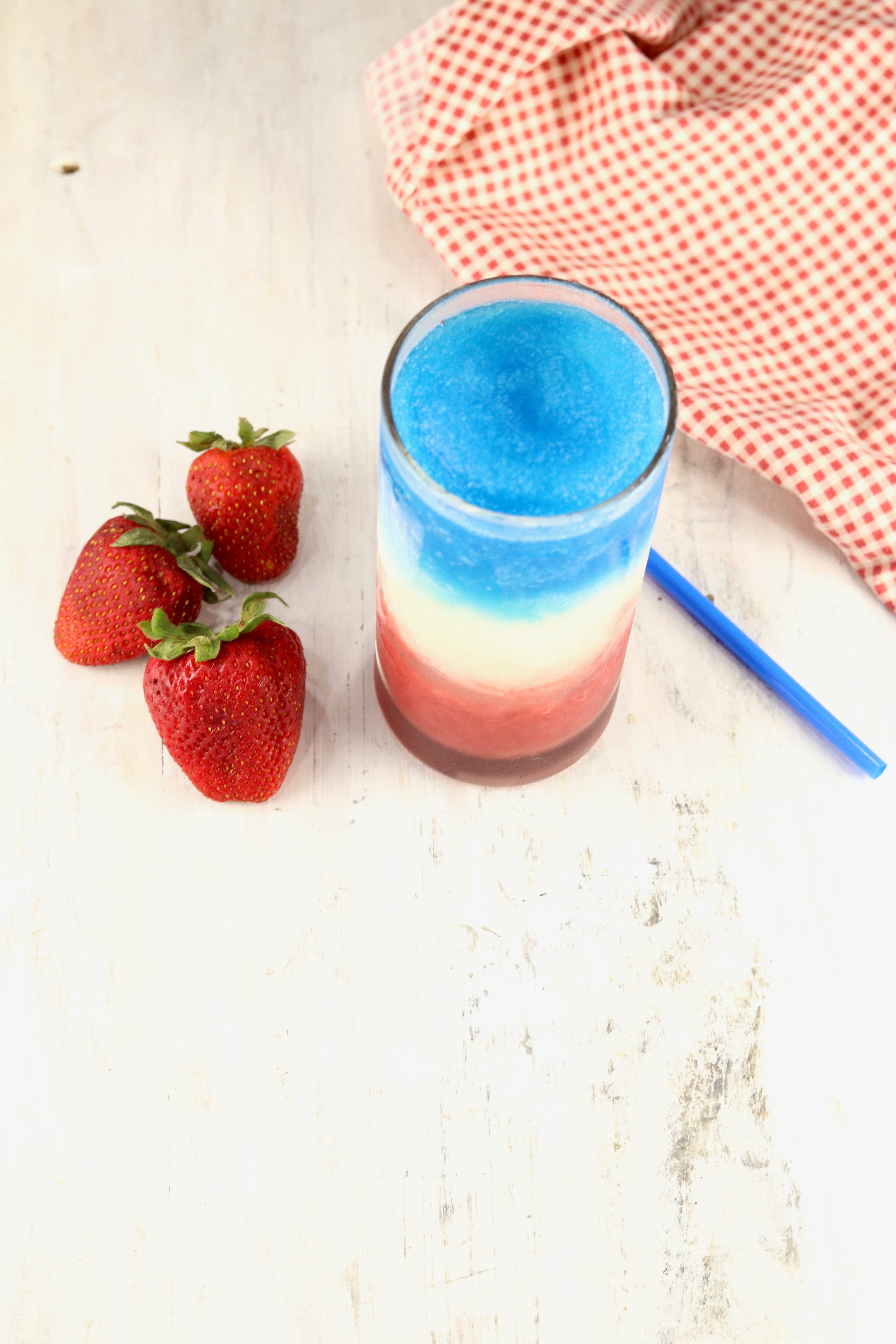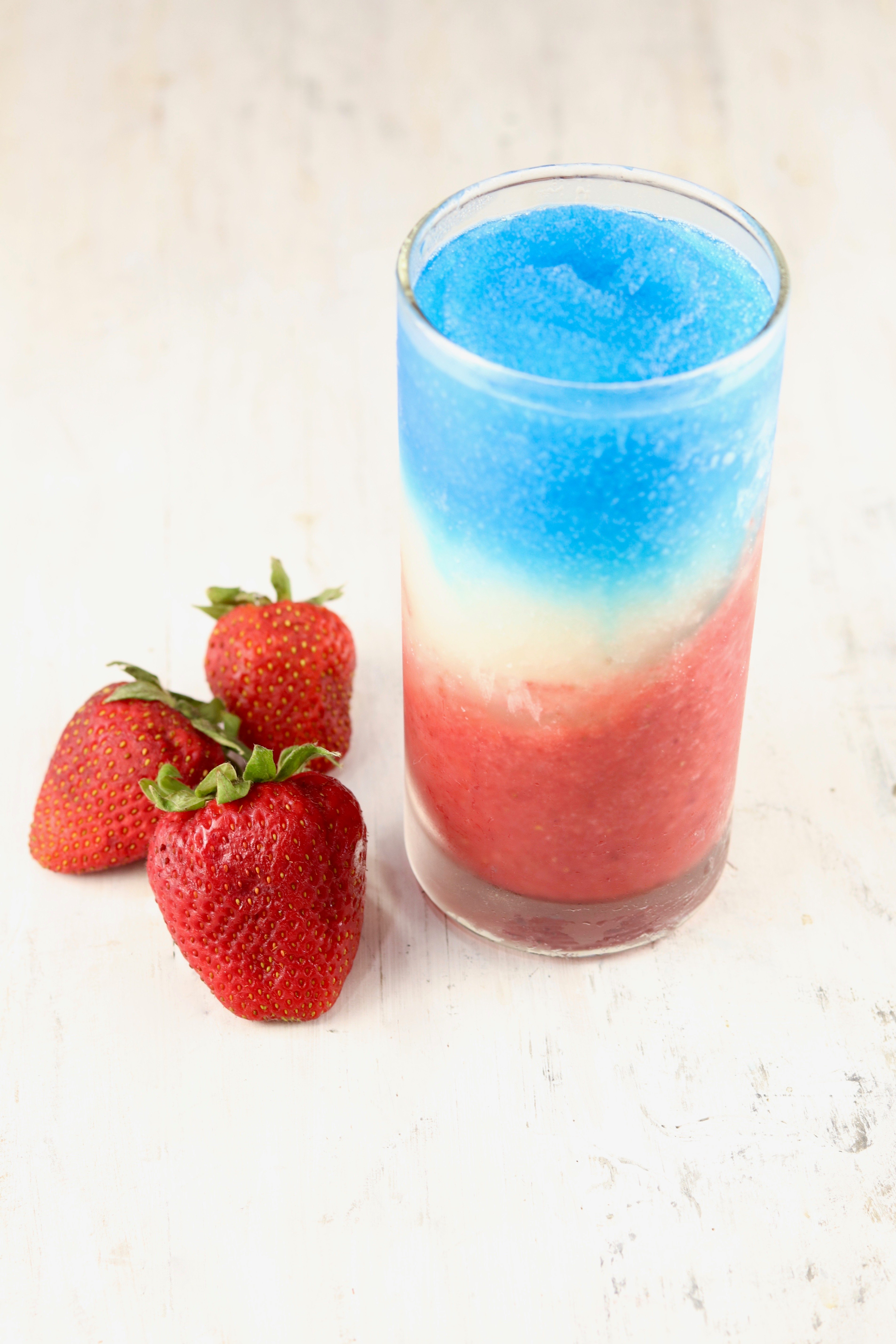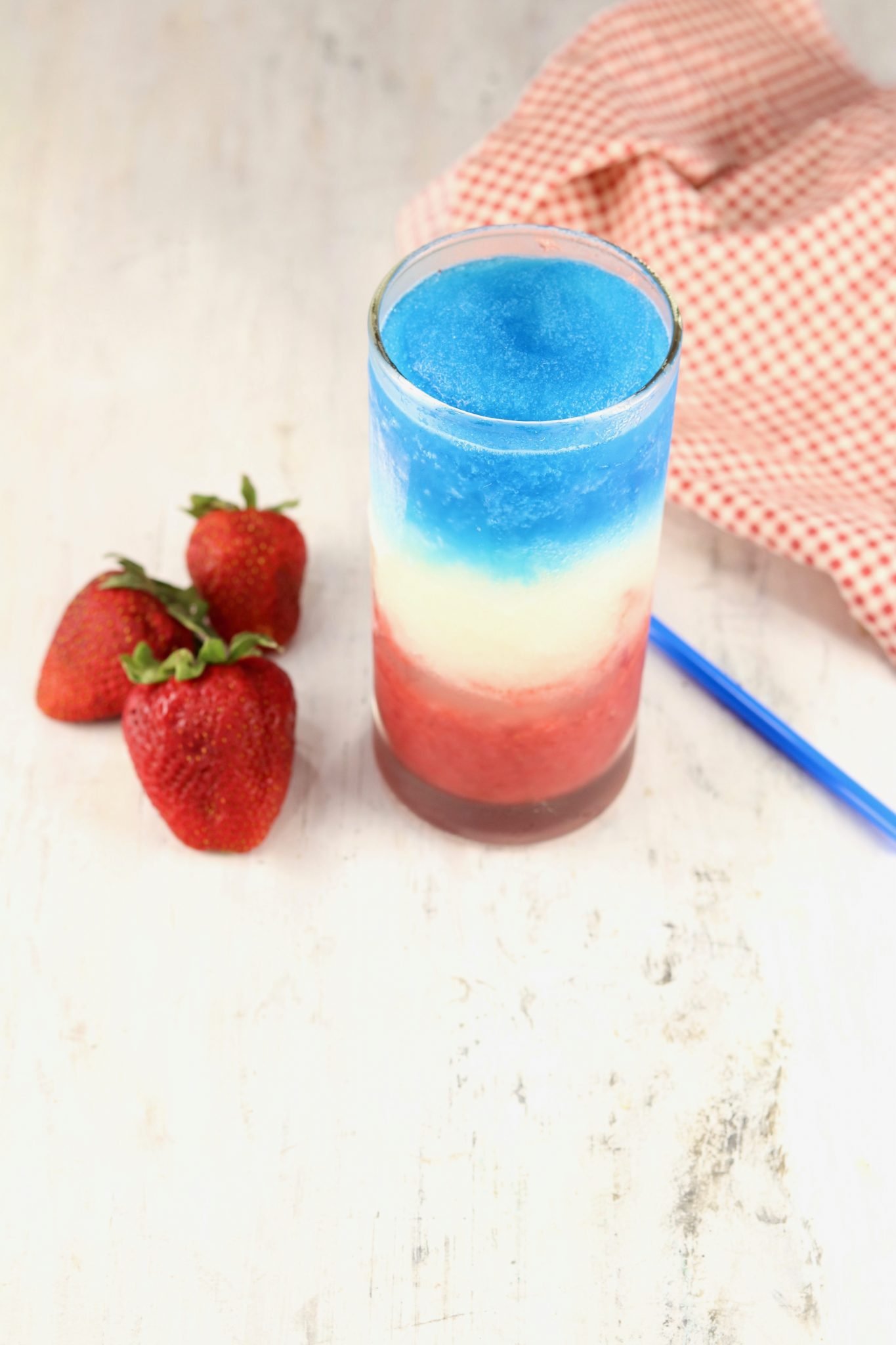 A layer my Easy Strawberry Daiquiri, Easy Daiquiri and topped off with a frozen blue Coconut Daiquiri makes for a fun presentation for patriotic party.