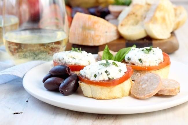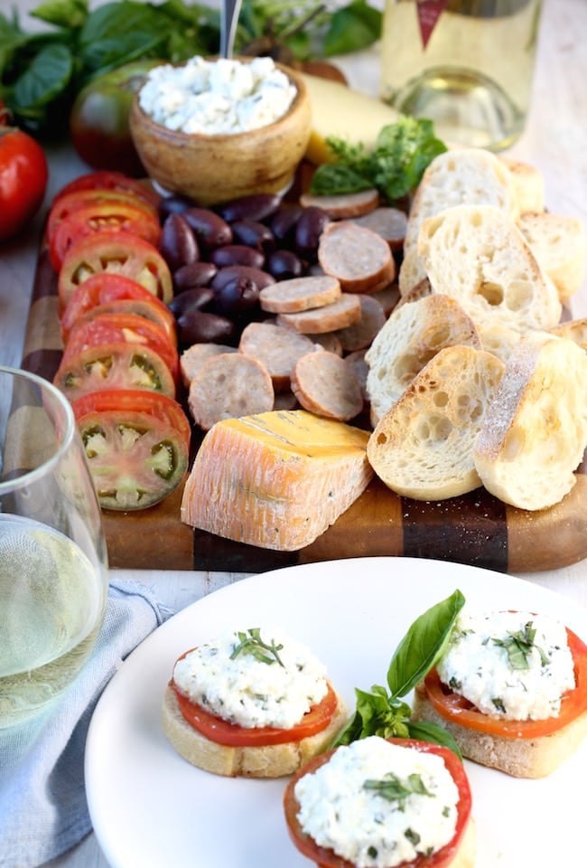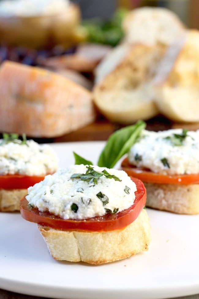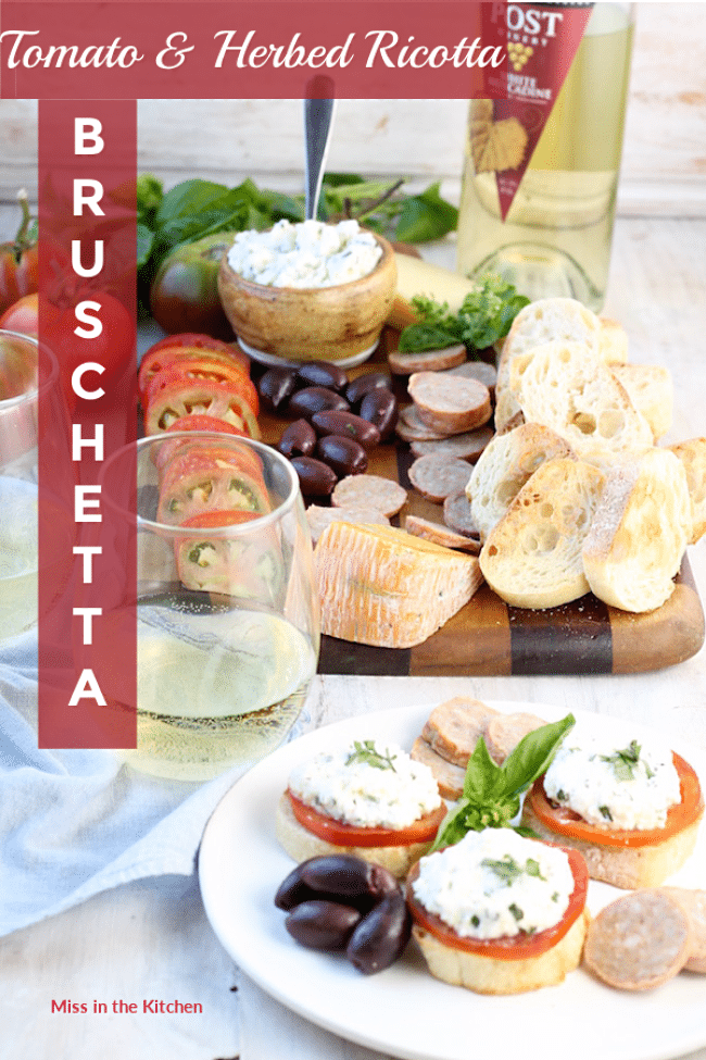 Fresh Tomato and Herbed Ricotta Bruschetta is a super simple appetizer for summer gatherings. The perfect addition to your charcuterie board or a date night with wine and cheese!