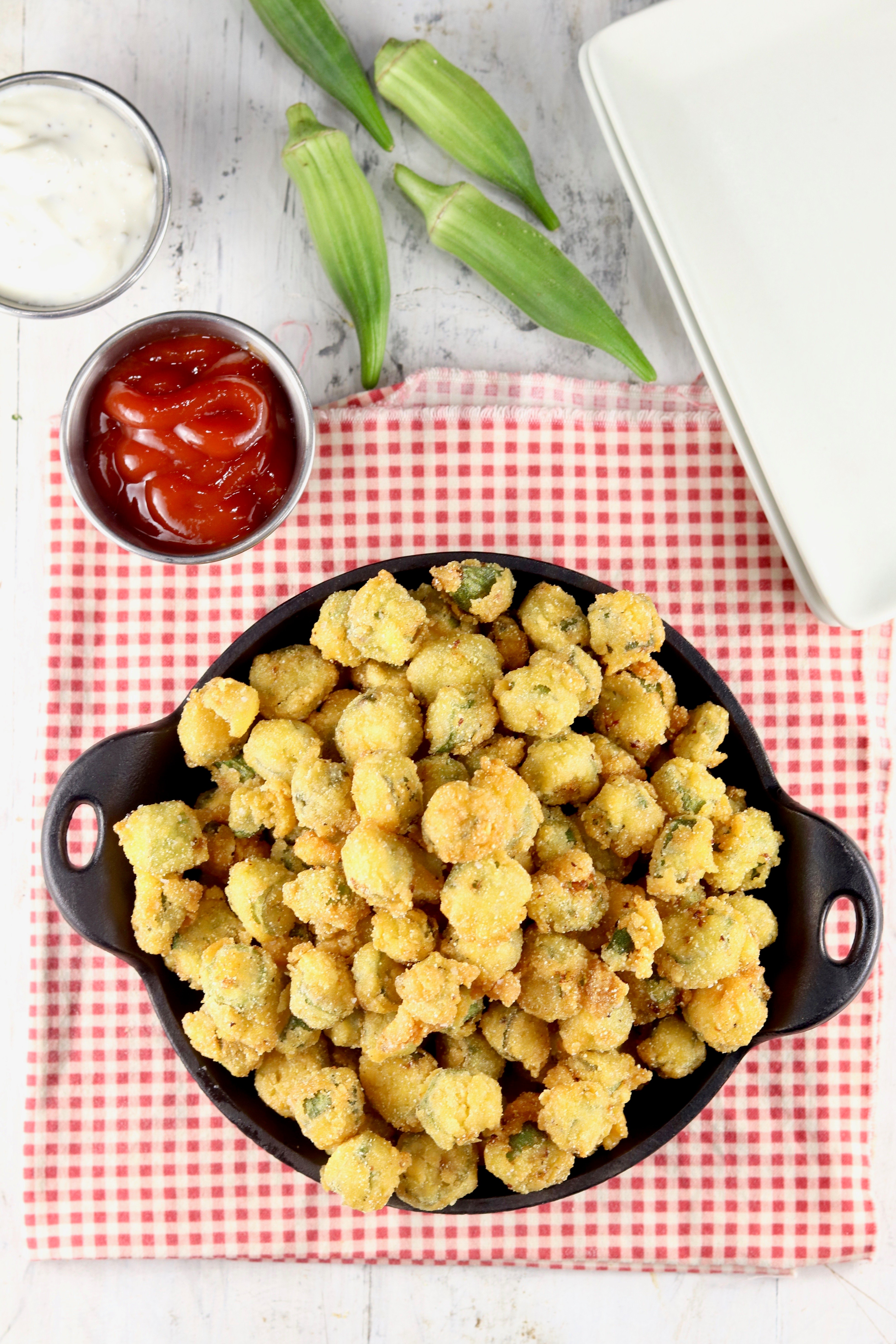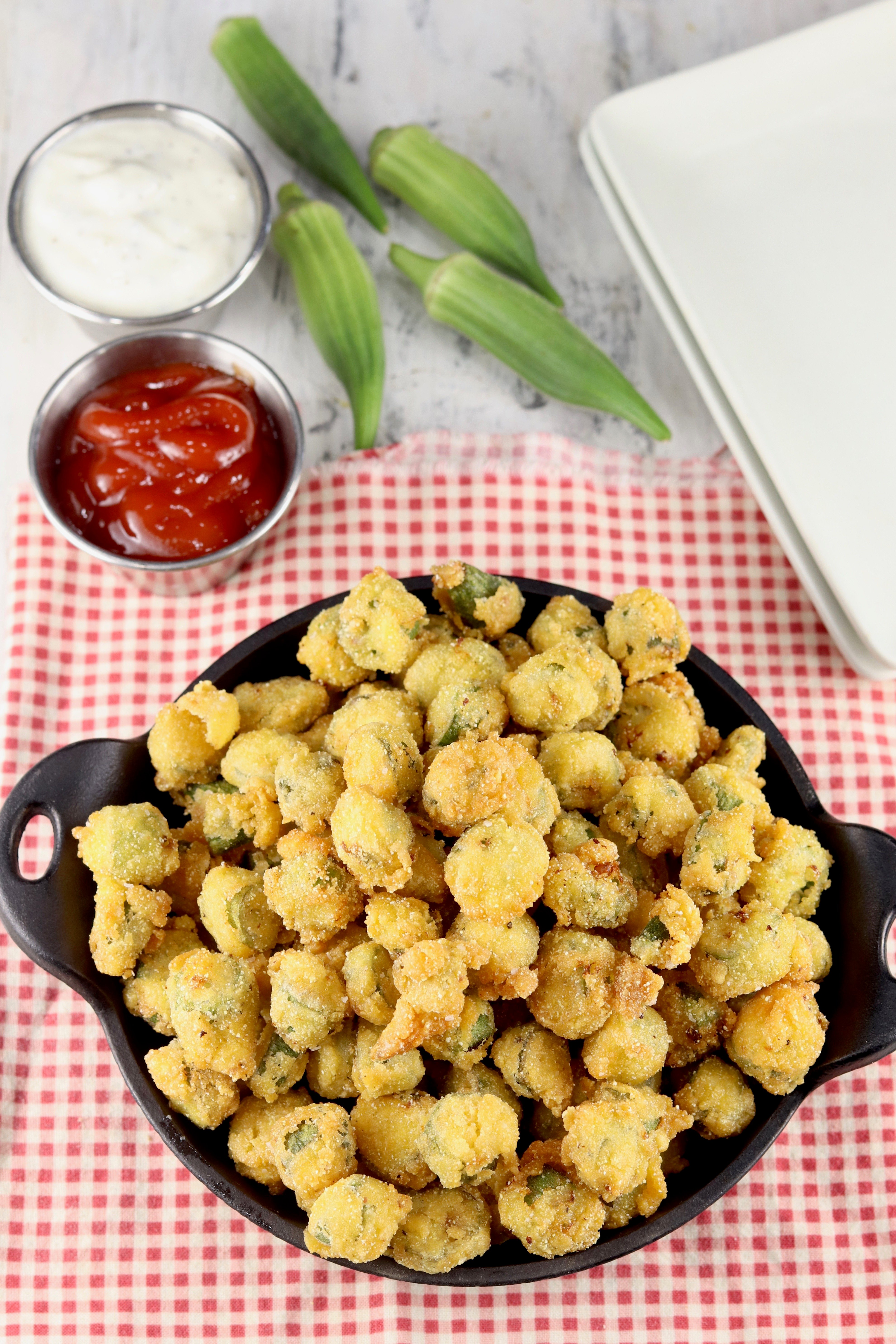 The texture of crispy fried okra is our favorite, it’s not the slimy texture that you sometimes get with stewed okra or when it’s cooked in soups. It’s a great side dish for just about any meal and we love to dip it in ketchup, ranch dressing or comeback sauce.